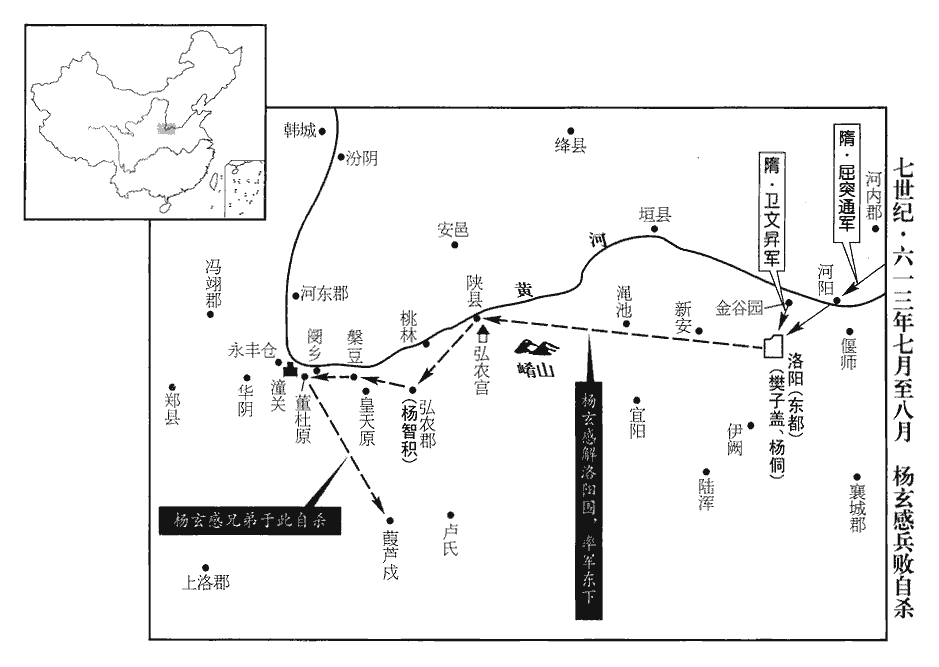 會華陰諸楊請為鄉導,華陰諸楊,玄感之宗黨也。華,戶化翻。鄉,讀曰嚮。壬辰‹二十›,玄感解東都圍,引兵西趣潼關‹陕西省潼关县›,潼關,在華陰縣。趣,七喻翻。宣言:「我已破東都、取關西‹函谷关以西›矣!」宇文述等諸軍躡之。至弘農宮‹河南省三门峡市›,隋志:河南郡陝縣,後魏置陝州恆農郡,開皇初廢郡,大業初廢州,置弘農宮。恆農即弘農,後魏避諱改曰恆農。父老遮說玄感曰:「宫城空虚,又多積粟,攻之易下。」說,式芮翻。易,以豉翻。玄感以為然。弘農‹河南省灵宝市›太守蔡王智積觀此,則帝廢陝州,改為弘農郡也。智積,高祖弟整之子。守,式又翻。謂官屬曰:「玄感聞大軍將至,欲西圖關中,若成其計,則難克也;當以計縻之,使不得進,不出一旬,可以成擒。」及玄感軍至城下,智積登陴pī詈之;陴,符支翻,城上女垣。詈,力智翻,罵也。玄感怒,留攻之。李密諫曰:「公今詐眾西入,軍事貴速,況乃追兵將至,安可稽留!若前不得據關,謂據潼關也。退無所守,大眾一散,何以自全!」玄感不從,遂攻之,燒其城門,智積於內益火,玄感兵不得入。三日不拔,乃引而西。至闅鄉‹河南省灵宝市西›,闅wén,音旻mín。宇文述、衛文昇、來護兒、屈突通等軍追及於皇天原‹阌乡城东›。水經註:玉澗水南出玉溪,北流逕皇天原西。周固記,開山東首,上平博,方可里餘,三面壁立,高千許仞,漢世祭天於其上,名之為皇天原。上有漢武思子臺。又北逕闅鄉城西。又有全鳩澗,水出南山,北逕皇天原東。隋志,闅鄉縣有玉澗、全鳩澗。玄感上槃豆‹灵宝市西五十千米›,即西魏將于謹所攻拔盤豆也。上,時掌翻。布陳亘五十里,陳,讀曰陣;下同。亘,古鄧翻。且戰且行,玄感一日三敗。八月,壬寅‹一›,玄感陳於董杜原‹河南灵宝市西›,諸軍擊之,玄感大敗,獨與十餘騎奔上洛‹陕西省商州市›。帝改商州為上洛郡。玄感欲由華陽以奔上洛也。騎,奇寄翻;下同。追騎至,玄感叱之,皆反走。至葭蘆戍‹河南省灵宝市西南›,葭,音加。獨與弟積善徒步走,自度不免,度,徒洛翻。謂積善曰:「我不能受人戮辱,汝可殺我!」積善抽刀斫殺之,因自刺不死,刺,七亦翻。為追兵所執,與玄感首俱送行在所。磔zhé玄感尸於東都市。三日,復臠而焚之。磔,陟格翻。復,扶又翻。臠,力兗翻。玄感弟玄獎為義陽‹河南省信阳市›太守,隋志:義陽郡,齊、梁之司州,後魏改曰郢州,後周改曰申州,大業初,改義州,尋改為義陽郡。守,式又翻。將赴玄感,為郡丞周旋玉所殺;隋書楊玄感傳作「周琁玉」。仁行為朝請大夫,伏誅於長安。楊素之門於是滅矣。朝,直遙翻。
