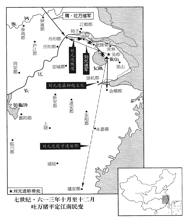 20劉元進帥其眾將渡江,帥,讀曰率。會楊玄感敗,朱燮、管崇共迎元進,推以為主,據吳郡,稱天子,燮、崇俱為尚書僕射,署置百官,毗陵‹江苏省常州市›、東陽‹浙江省金华市›、會稽、建安‹福建省福州市›豪傑多執長吏以應之。帝改婺州為東陽郡。大業初,改泉州為閩州,尋改為建安郡。長,知兩翻。會,工外翻。帝遣左屯衛大將軍代‹雁门郡·山西省代县›人吐萬緒、隋書:吐萬緒,代郡鮮卑人。吐萬,蓋鮮卑複姓也。隋志:大業初,於馬邑善陽縣置代郡。光祿大夫下邽‹陕西省渭南市北›魚俱羅隋志:下邽縣屬馮翊郡。風俗通:魚姓,宋公子魚之後。將兵討之。將,即亮翻,又音如字。