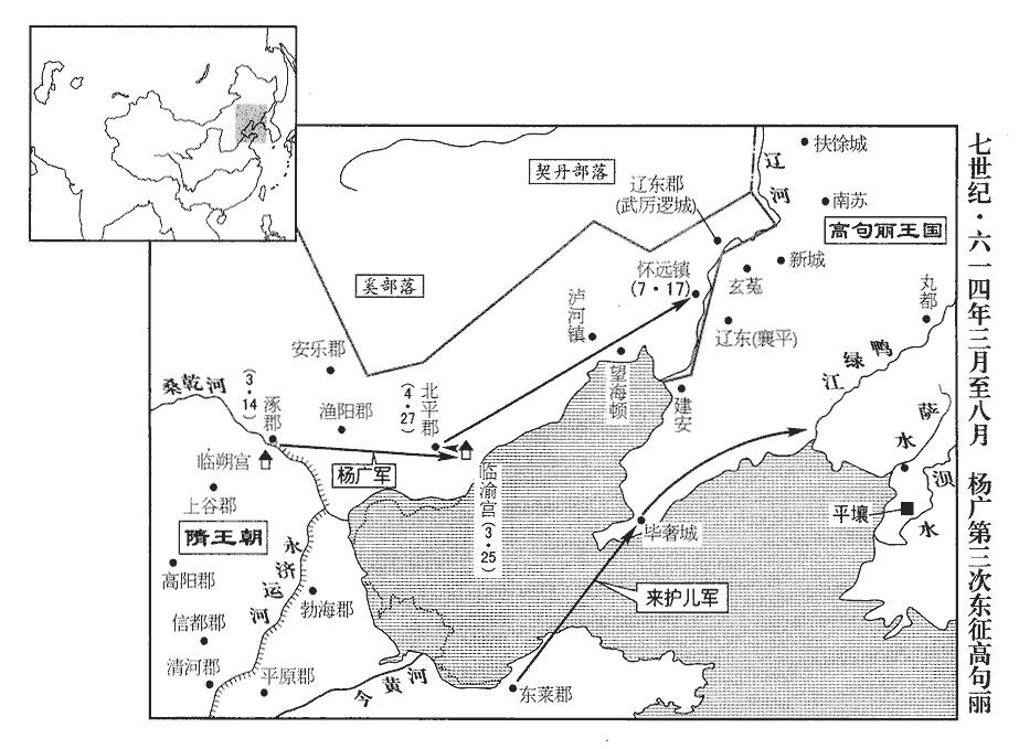 1春,正月,丁丑‹二›,‹杨广,本年四十五岁›詔徵天下兵集涿郡‹北京市›。始募民為驍果為驍果作逆張本。驍,古堯翻。脩遼東古城以貯軍糧。漢、晉以來,遼東郡皆治襄平‹辽宁省辽阳市›,慕容氏始鎮平郭。前伐高麗,圍遼東,言即漢襄平城,今言復脩古城,蓋城郭有遷徙也。貯,丁呂翻。