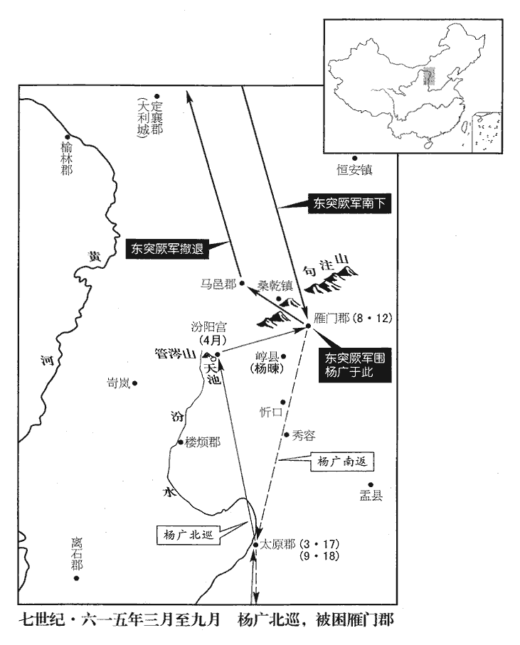 戊辰‹八›,始畢帥騎數十萬,謀襲乘輿,朝,直遙翻。帥,讀曰率。騎,奇寄翻;下同。乘,繩證翻;下同。義成公主先遣使者告變。壬申‹十二›,車駕馳入鴈門‹山西省代县›,隋志:鴈門郡,後周置肆州,開皇五年改為代州,帝改鴈門郡。齊王暕以後軍保崞guō縣‹山西省原平市北崞阳镇›。崞,漢縣,後魏置石城縣,開皇十年改曰平寇。大業初改為崞縣,屬鴈門郡。暕,古限翻。崞,音郭。癸酉‹十三›,突厥圍鴈門,上下惶怖,怖,普布翻。撤民屋為守禦之具,城中兵民十五萬口,食僅可支二旬,鴈門四十一城,突厥克其三十九,唯鴈門、崞不下。突厥急攻鴈門,矢及御前;上‹杨广›大懼,抱趙王杲gǎo而泣,目盡腫。