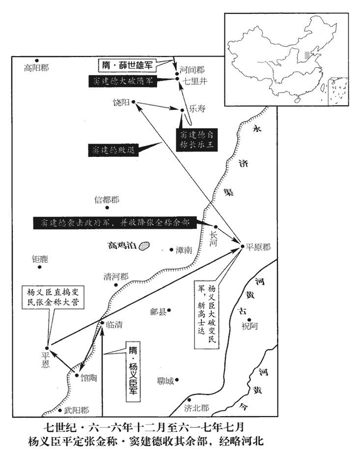 20涿郡通守郭絢絢,許縣翻將兵萬餘人討高士達。士達自以才略不及竇建德,乃進建德為軍司馬,悉以兵授之。建德請士達守輜重,自簡精兵七千人拒絢,詐為與士達有隙而叛,遣人請降於絢,降,戶江翻。願為前驅,擊士達以自效。絢信之,引兵随建德至長河‹山东省德州市›,隋志,長河縣屬平原郡,舊曰廣川,仁壽初改名。不復設備。建德襲之,殺虜數千人,斬絢首,獻士達,張金稱餘眾皆歸建德。楊義臣乘勝至平原,欲入高雞泊‹河北省故城县西›討之。建德謂士達曰:「歷觀隋將,將,即亮翻。善用兵者無如義臣,今滅張金稱而來,其鋒不可當。請引兵避之,使其欲戰不得,坐費歲月,將士疲倦,然後乘間擊之,間,古莧翻。乃可破也。不然,恐非公之敵。」士達不從,留建德守營,自帥精兵逆擊義臣,帥,讀曰率。戰小勝,因縱酒高宴。建德聞之曰:「東海公未能破敵,遽自矜大,禍至不久矣。」後五日,義臣大破士達,於陳斬之,乘勝逐北,趣其營,陳,讀曰陣。趣,七喻翻。營中守兵皆潰。建德與百餘騎亡去,至饒陽‹河北省饶阳县›,隋志,饒陽縣屬河間郡。騎,奇寄翻。乘其無備,攻陷之,收兵,得三千餘人。義臣既殺士達,以為建德不足憂,引去。建德還平原,收士達散兵,收葬死者,為士達發喪,軍復大振,為,于偽翻。考異曰:革命記曰:「高士達、高德政與宗族鳩集離散,得五萬人,捺渦於四根柳樹,入高雞泊中,德政自號東海公,以建德為長史。俄而德政病死,即有高欓dǎng脫繼立為東海公,建德仍依舊任。欓脫領兵劫抄,至晏城府,為城中兵所射而死。賊之異姓皆欲建德為主,高氏一族不欲更立別人,遂分為兩軍,各相猜貳。然高氏兵精強,建德恐被屠,乃詐分為官軍,告高氏併力共擊之。高氏無疑,即合軍共鬬,兵刃纔交,建德自後擊之,高氏兵大亂,建德兩軍擁掠遣坐,簡其驍勇及頭首千餘人,殺之,遂總統其眾。建德自號長樂王,寇抄州縣,即大業十二年二月也。」今從隋、唐書。自稱將軍。先是,群盜得隋官及士族子弟,皆殺之,先,悉薦翻。獨建德善遇之;由是隋官稍以城降之,聲勢日盛,勝兵至十餘萬人。降,戶江翻;下同。勝,音升。