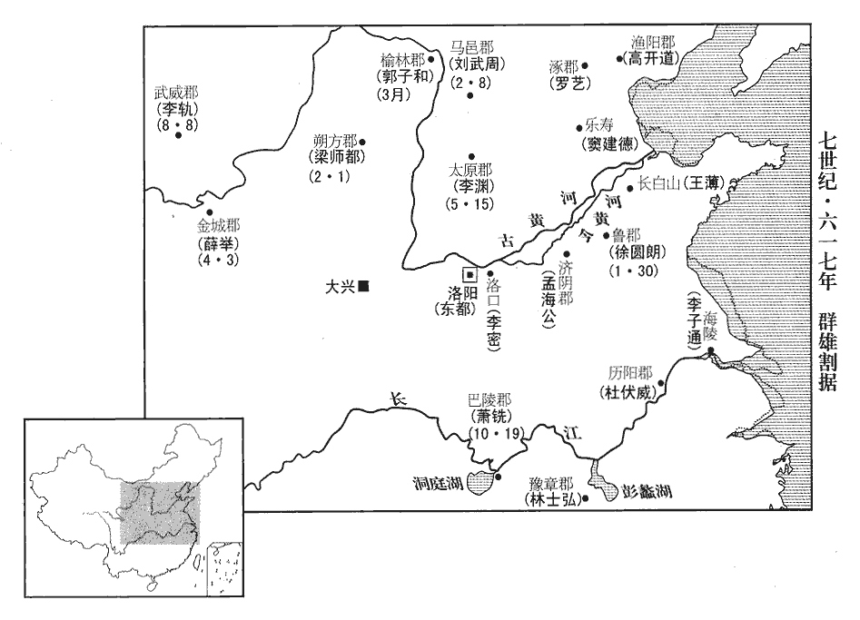 8鴈門‹山西省代县›郡丞河東‹山西省永济市›陳孝意,與虎賁郎將王智辯共討劉武周,圍其桑乾鎮‹山西省朔州市东南›。桑乾,漢縣;後魏為桑乾郡,後周廢,隋以為鎮,在馬邑郡善陽縣界。賁,音奔。將,即亮翻。乾,音干。壬寅‹二十一›,武周與突厥合兵擊智辯,殺之;孝意奔還鴈門。三月,丁卯‹十七›,武周襲破樓煩郡‹山西省静乐县›,進取汾陽宮‹山西省宁武县南管涔山上›,獲隋宮人,以賂突厥始畢可汗;厥,九勿翻。可,從刊入聲。汗,音寒。始畢以馬報之,兵勢益振,又攻陷定襄‹内蒙古和林格尔县›。煬帝改雲州為定襄郡。突厥立武周為定楊可汗,言將使之定楊州也。考異曰:新、舊唐書武周皆無國號,惟創業起居註云,國號定楊。遺以狼頭纛。隋書曰:突厥本狼種。牙門建狼頭纛,示不忘本也。遺,于季翻。武周即皇帝位,立妻沮氏為皇后,沮,子余翻。改元天興。以衛士楊伏念為尚書左僕射,妹壻同縣苑君璋為內史令。武周引兵圍鴈門,陳孝意悉力拒守,乘間出擊武周,屢破之;間,古莧翻;下同。既而外無救援,遣間使詣江都,皆不報。使,疏吏翻。孝意誓以必死,旦夕向詔敕庫俯伏流涕,悲動左右。圍城百餘日,食盡,校尉張倫殺孝意以降。校,戶教翻。降,戶江翻。
