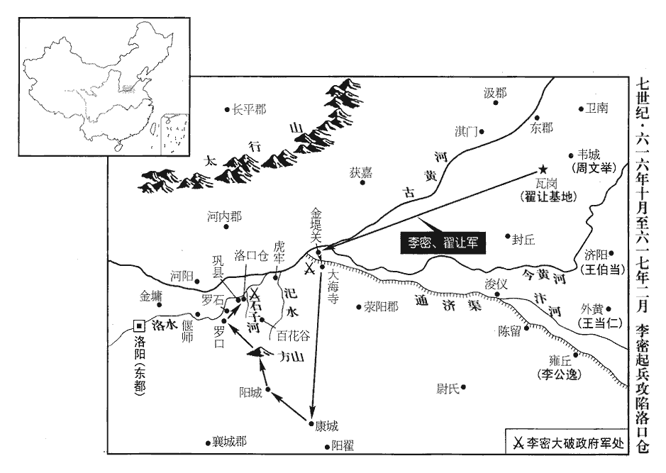 7李密說翟讓曰:說,式芮翻。翟,萇伯翻。「今東都‹洛阳›空虛,兵不素練;越王‹杨侗›沖幼‹本年十四岁›,留守諸官政令不壹,士民離心。段達、元文都,闇而無謀,以僕料之,彼非將軍之敵。若將軍能用僕計,天下可指麾而定。」乃遣其黨裴叔方覘東都虛實,守,式又翻。今,力定翻。覘,丑廉翻,又丑豔翻。留守官司覺之,始為守禦之備,且馳表告江都。密謂讓曰:「事勢如此,不可不發。兵法曰:『先則制於己,後則制於人。』今百姓饑饉,洛口倉‹河南省巩县东›多積粟,去都百里有餘,都,謂東都。將軍若親帥大眾,輕行掩襲,帥,讀曰率。彼遠未能救,又先無豫備,取之如拾遺耳。比其聞知,比,必寐翻。吾已獲之,發粟以賑窮乏,遠近孰不歸附!百萬之眾,一朝可集,枕威養銳,枕,職任翻。以逸待勞,縱彼能來,吾有備矣。然後檄召四方,引賢豪而資計策,選驍悍而授兵柄,驍,堅堯翻。悍,戶旰翻;又下罕翻。除亡隋之社稷,布將軍之政令,豈不盛哉!」讓曰:「此英雄之略,非僕所堪;惟君之命,盡力從事,請君先發,僕為後殿。」殿,丁甸翻。庚寅‹九›,密、讓將精兵七千人將,即亮翻。出陽城‹河南省登封县东南›北,踰方山‹河南省荥阳市西南›,自羅口‹河南省巩县西南›襲興洛倉‹即洛口仓,巩县东›,破之;隋志,陽城縣屬河南郡。陸渾縣有方山。鞏縣有興洛倉。魏收地形志,鞏縣有長羅川。羅口,蓋即長羅川口。水經:羅水出方山西北流,謂之長羅川,又西北過訾城東北而入于洛。括地志:方山,在洛州汜水縣東南三十二里,汜水所出也。開倉恣民所取,老弱襁負,道路相屬。襁,居兩翻。屬,之欲翻。