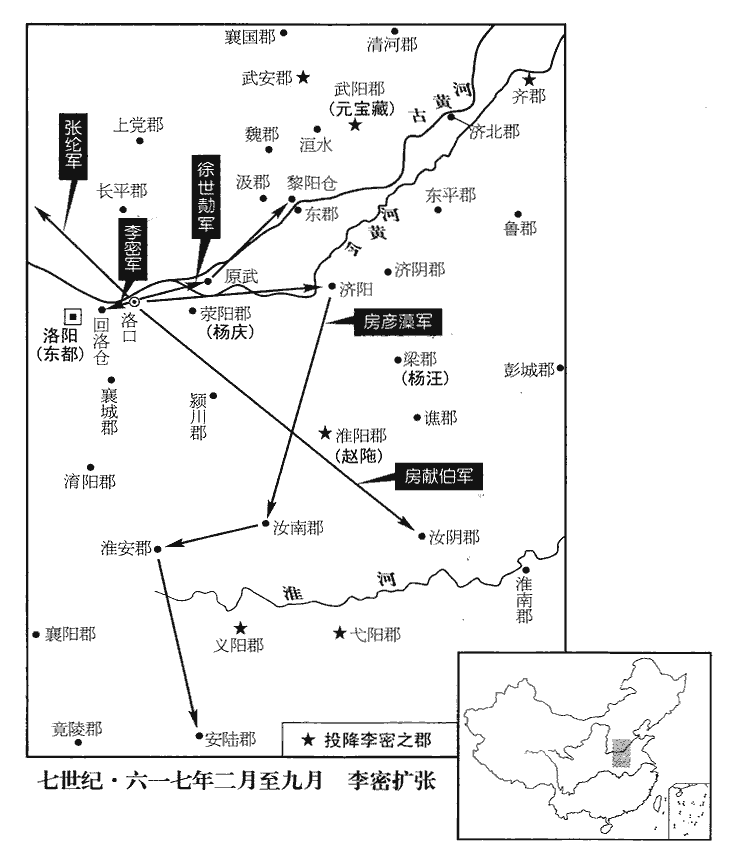 14煬帝命監門將軍涇陽‹陕西省泾阳县›龐玉、隋志:左、右監門府各將軍一人,掌宮殿門禁及守衛事。涇陽縣,屬京兆郡。監,工銜翻。虎賁郎將霍世舉將關內兵援東都。柴孝和說李密曰:賁,音奔。將,即亮翻。說,式芮翻。「秦地山川之固,秦、漢所憑以成王業者也。今不若使翟司徒守洛口,裴柱國守回洛,翟司徒,讓也;裴柱國,仁基。翟,萇伯翻。明公自簡精銳西襲長安。既克京邑,業固兵強,然後東向以平河、洛,傳檄而天下定矣。方今隋失其鹿,豪傑競逐,不早為之,必有先我者,先,悉薦翻。悔無及矣!」密曰:「此誠上策,吾亦思之久矣。但昏主尚存,從兵猶眾,從,才用翻。我所部皆山東‹崤山以东›人,見洛陽未下,誰肯從我西入!諸將出於群盜,留之各競雌雄,如此,則大業隳矣。」孝和曰:「然則大軍既未可西上,僕請間行觀釁。」將,即亮翻。上,時掌翻。間,古莧翻。密許之。孝和與數十騎至陝縣‹河南省三门峡市›,隋志,陝縣屬河南郡。騎,奇寄翻。陝,式冉翻。山賊歸之者萬餘人。時密兵鋒甚銳,每入苑,與隋兵連戰。苑,即大業初所築西苑。會密為流矢所中,尚臥營中,丁丑‹二十八›,越王侗使段達與龐玉等夜出兵,陳於回洛倉西北。陳,讀曰陣。密與裴仁基出戰,達等大破之,殺傷太半,密乃棄回洛,奔洛口。考異曰:略記云:「四月戊申,段達等帥關內兵陳於倉西、倉南,密出兵拒戰,大破兇醜,密還固倉。五月丁丑,達等又出兵陳於倉西、倉北,密又來拒,大破之,密奔洛口。」按隋書、北史、新•舊唐書皆云,「密為流矢所中,臥營中,東都出兵擊之,密眾大潰,棄回洛倉,奔洛口。」俱無月日。河洛記云:「密軍失利,歸於鞏縣,東都復得回洛倉。」蒲山公傳曰:「五月二十八日,越王夜出師,使段達等大戰於倉西、北;密軍敗績,歸於鞏縣。」亦不云密連月再敗也。戊申,四月二十八日;丁丑,五月二十八日。蓋趙毅承蒲山公傳,誤以密一敗分為二事也。龐玉、霍世舉軍於偃師‹河南省偃师县›,龐,薄江翻。杜佑曰:偃師,帝嚳所都,古西亳也,湯亦都之。武王伐紂,迴師息戎,遂名。偃師縣屬河南郡。柴孝和之眾聞密退,各散去。孝和輕騎歸密,楊德方、鄭德韜皆死。考異曰:楊德方,壺關錄作「王德仁」,今從河洛記。密以鄭頲為左司馬,頲,他鼎翻。滎陽‹河南省郑州市›鄭乾象為右司馬。考異曰:隋、唐書皆作「虔象」,唯壺關錄作「乾象」,云「密殺其兄乾覆。乾覆之子會通後從盛彥師殺密」,今從之。