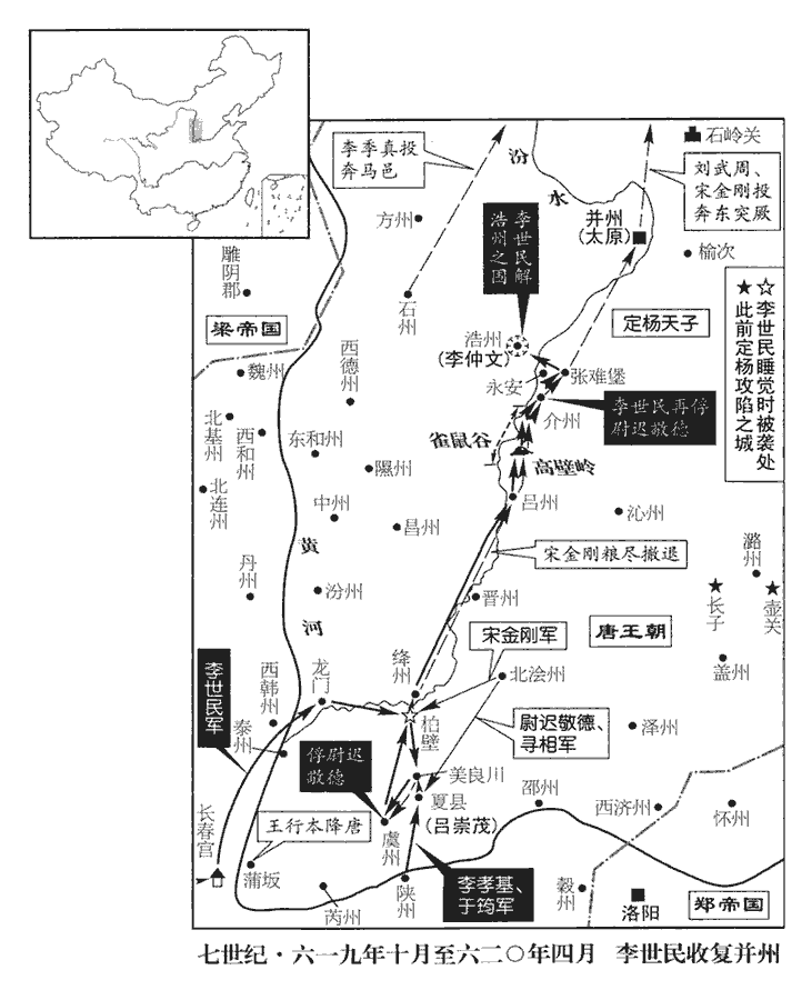 1春,正月,將軍秦武通攻王行本於蒲反‹山西省永济县›。行本出戰而敗,糧盡援絕,欲突圍走,無隨之者,戊寅‹十四›,開門出降。降,戶江翻。辛巳‹十七›,上‹李渊,本年五十五岁›幸蒲州,斬行本。蒲州治蒲反。宋白曰:蒲州,漢之河東郡蒲反縣,本舜都,周為虞、虢、耿、揚、芮之地,戰國時魏地,漢置河東郡,後魏初置雍州,延和元年,改泰州,後周改蒲州。秦王世民輕騎謁上於蒲州。騎,奇寄翻;下同。宋金剛圍絳州‹山西省新绛县›。絳州治正平。癸巳‹二十九›,上還長安。