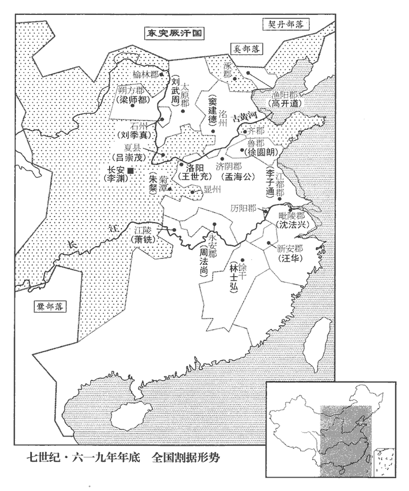 9突厥‹瀚海沙漠群›處羅可汗迎楊政道‹杨广的孙儿,本年二岁›,立為隋王。楊政道,齊王暕遺腹之子。厥,九勿翻。處,昌呂翻。可,從刊入聲。汗,音寒。中國士民在北者,處羅悉以配之,有眾萬人。置百官,皆依隋制,居于定襄‹内蒙古和林格尔县›。此蓋隋之定襄郡也,治大利城。