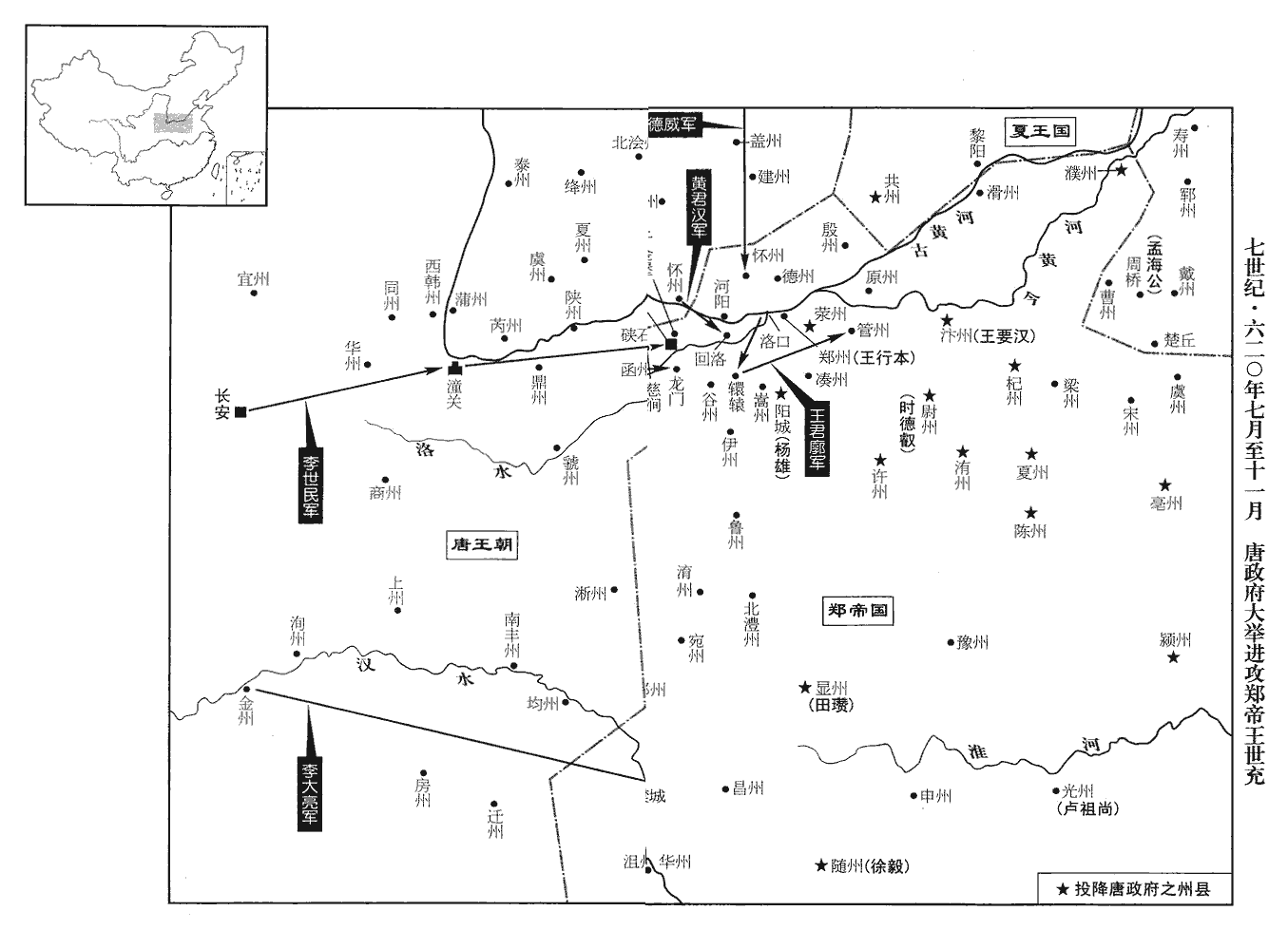 8王世充太子玄應將兵數千人,自虎牢‹河南省荥阳市汜水镇西›運糧入洛陽,秦王世民遣將軍李君羨邀擊,大破之,玄應僅以身免。