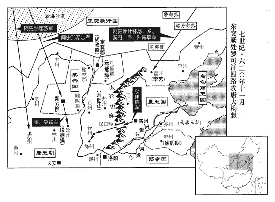 63張舉、劉旻之降也,是年八月,張舉降。九月,劉旻降。梁師都大懼,遣其尚書陸季覽說突厥處羅可汗曰:「比者中原喪亂,說,輸芮翻。比,毗至翻。喪,息浪翻。分為數國,勢均力弱,故皆北面歸附突厥。今定楊可汗既亡,是年四月,劉武周敗亡。天下將悉為唐有。師都不辭灰滅,亦恐次及可汗,不若及其未定,南取中原,如魏道武所為,事見晉孝武帝紀。師都請為鄉導。」鄉,讀曰嚮。處羅從之,謀使莫賀咄設入自原州‹宁夏固原县›,平涼郡置原州。處,昌呂翻。咄,當沒翻。泥步設與師都入自延州‹陕西省延安市›,【章:十二行本「州」下有「處羅入自并州」六字;乙十一行本同;孔本同;張校同;退齋校同。】突利可汗與奚‹滦河上游›、霫xí‹辽河以北›、契丹‹辽河上游›、靺鞨‹黑龙江下游›入自幽州,可,從刊入聲。汗,音寒。奚與契丹本皆東胡種,保烏丸山者,其後為奚,保鮮卑山者,其後為契丹。霫與突厥同俗,保冷陘山,南契丹,東靺鞨,西拔野古。靺鞨居肅慎地,亦曰挹婁,元魏時曰勿吉。霫,而立翻。契,欺訖翻,又音喫。靺,莫撥翻。鞨,戶割翻。考異曰:舊突厥傳:「大業中,突利年數歲,始畢遣領東牙之兵,號泥步設,頡利嗣位,以為突利可汗。」按梁師都傳,此際有泥步設,又有突利可汗。然則突利、處羅時已為小可汗,非頡利嗣位後也。高祖實錄云:「處羅欲分兵大掠中國,於懷戎、鴈門、靈武、涼州四道俱入。」今從舊書梁師都傳。會竇建德之師自滏口‹太行八陉之四·河北省武安市西南›西入,會于晉‹山西省临汾市›、絳‹山西省新绛县›。滏口,滏水之口,在磁州滏陽縣界。晉州,隋之臨汾郡。絳州,隋之絳郡。滏,音釜。莫賀咄者,處羅之弟咄苾也;突利者,始畢之子什鉢苾也。咄,當沒翻。苾,毗必翻。