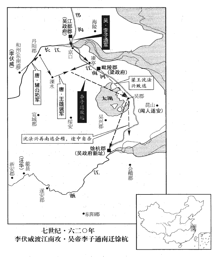 子通復東走太湖,太湖在蘇州吳縣東南五十里。收合亡散,得二萬人,襲沈法興於吳郡,大破之。法興帥左右數百人棄城走,吳郡賊帥聞人遂安遣其將葉孝辯迎之,聞人,複姓,今吳中亦以為著姓。賊帥,所類翻。將,即亮翻。法興中塗而悔,欲殺孝辯,更向會稽‹浙江省绍兴市›。會稽,越州。會,古外翻。孝辯覺之,法興窘迫,赴江溺死。子通軍勢復振,【章:十二行本「振」下有「帥其群臣」四字;乙十一行本同;孔本同;張校同;退齋校同。】徙都餘杭‹浙江省杭州市›,餘杭,杭州。盡收法興之地,北自太湖,南至嶺‹仙霞岭·浙江、福建、江西三省交界处›,嶺,五嶺也。東包會稽,西距宣城‹安徽省宣州市›,按子通之地,西距宣城耳,南境安能至嶺哉!史大而言之耳。會,古外翻。皆有之。