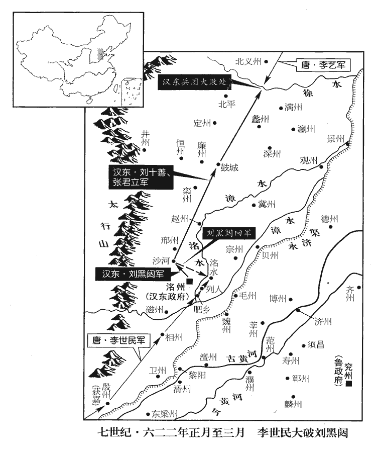 9幽州‹总部设北京市›總管李藝將所部兵數萬會秦王世民討劉黑闥,黑闥聞之,留兵萬人,使范願守洺州,自將兵拒藝。夜,宿沙河‹河北省沙河市北沙河城›,隋以漢襄國縣為龍岡縣,又分龍岡置沙河縣,時屬邢州。宋白曰:沙河即湡yú水也。水經云:湡水出趙郡襄國縣西山,東過沙河縣,沙河在縣南五里。范成大曰:臨洺鎮東去洺州三十五里,過洺河三十里至沙河縣,二十五里至邢州。將,即亮翻;下同。程名振載鼓六十具,於城西二里隄上急擊之,城中地皆震動。范願驚懼,馳告黑闥;黑闥遽還,遣其弟十善與行臺張君立將兵一萬擊藝於鼓城‹河北省晋州市›。壬子‹三十›,戰於徐河‹今漕河,流经河北省保定市北,注入海河›,鼓城縣,舊曰曲陽,後齊廢;隋開皇十六年分置晉陽縣,十八年,改為鼓城。按水經註,下曲陽縣有鼓聚,此因春秋鼓子之國以名縣也;唐屬趙州。水經:徐水出廣昌縣東南大嶺下,東北逕五回縣,又逕北平縣界,東南出山,又東逕清苑城北,又東至高陽入河。范成大曰:徐河在清苑北十里。十善、君立大敗,所失亡八千人。