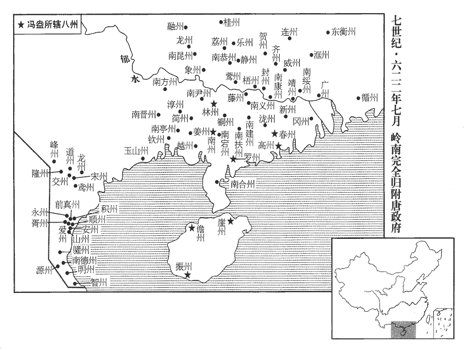 41丁酉‹十八›,隋漢陽‹甘肃省礼县南›太守馮盎承李靖檄,帥所部來降,守,式又翻。帥,讀曰率。降,戶江翻;下同。以其地為高‹广东省阳江市›、羅‹广东省化州市›、春‹广东省阳春市›、白‹广西博白县。此时应称南州›、崖‹海南省琼山县›、儋dān‹海南省儋州市›、林‹广西桂平县南›、振‹海南省三亚市西崖城镇›八州,高州,高涼郡。羅州,石城郡。春州,陽春郡。白州,南昌郡。崖州,珠崖郡。林州,桂林郡。振州,臨振郡。羅州,今化州。白州,今鬱林州之博白縣。崖、儋、振皆在海外。振州,今吉陽軍地。林州,後改繡州。投荒錄:高州高涼郡,土厚而山環遶,高而稍汙,故名。羅州,宋將檀道濟於陵羅江口築城,因置羅州,今廢。陵羅縣在化州北一百二十里。宋白曰:州在陵、羅二水之間。春州治陽春縣,故名。白州以博白江名。崖州以珠崖名。儋州以儋耳名。林州以綏懷林邑名。振州以漢臨振古縣而名。儋,丁甘翻。以盎為高州‹总部设广东省阳江市›總管,封耿國公。先是,或說盎曰:「唐始定中原,未能及遠,公所領二十州地已廣於趙佗,趙佗,見漢紀。先,悉薦翻。說,輸芮翻。佗,徒何翻。宜自稱南越王。」盎曰:「吾家居此五世矣,馮氏居高涼事始見一百六十三卷梁簡文帝大寶元年。為牧伯者不出吾門,富貴極矣,常懼不克負荷,為先人羞,敢効趙佗自王一方乎!」荷,下可翻,又如字。王,于況翻。遂來降。於是嶺南‹南岭以南›悉平。