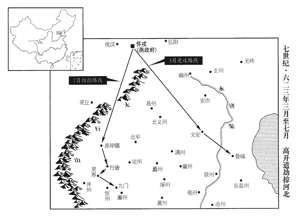 12己未‹十九›,高開道‹燕王,首都怀戎河北省怀来县›將張金樹殺開道來降。將,即亮翻。降,戶江翻;下同。開道見天下皆定,欲降,自以數反覆不敢;高開道既降而復叛,自知有反覆之罪。數,所角翻。且恃突厥‹瀚海沙漠群›之眾,遂無降意。其將卒皆山‹崤山›東人,思鄉里,咸有離心。開道選勇敢士數百,謂之假子,常直閤內,使金樹領之。故劉黑闥將張君立亡在開道所,與金樹密謀取開道。金樹遣其黨數人入閤內,與假子遊戲,向夕,潛斷其弓弦,斷,丁管翻。藏刀槊於牀下,合瞑,抱之趨出,人睡則目合而瞑。槊,色角翻。瞑,莫定翻。金樹帥其黨大譟,攻開道閤,帥,讀曰率。譟,蘇到翻。假子將禦之,弓弦皆絕,刀槊已失,爭出降;君立亦舉火於外與相應,內外惶擾。開道知不免,乃擐甲持兵坐堂上,與妻妾奏樂酣飲,擐,音宦。酣,戶甘翻。眾憚其勇,不敢逼。天且明,開道縊,縊,於賜翻,又於計翻。妻妾及諸子乃自殺。金樹陳兵,悉收假子斬之,并殺君立,死者五百餘人。遣使來降,詔以其地置媯guī州‹郡政府设怀戎河北省怀来县›。以媯水名州。媯,俱為翻。壬戌‹二十二›,以金樹為北燕州‹即妫州,北齐时称北燕州›都督。媯州,媯川郡,治懷戎縣。北齊置北燕州,本治懷戎,唐既以懷戎之地置媯州,又以北燕州都督之名寵金樹也。燕,因肩翻。