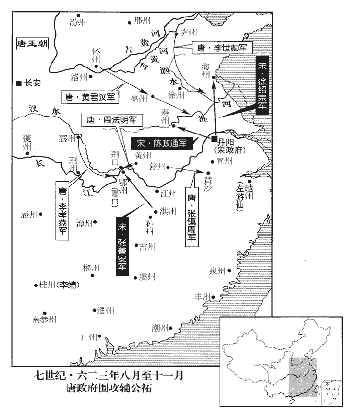 57黃州‹总部设湖北省新洲县›總管周法明將兵擊輔公祏,黃州,漢邾縣地,蕭齊置齊安郡,隋置黃州。祏,音石。張善安據夏口‹湖北省武汉市›,拒之。將,即亮翻。夏,戶雅翻。法明屯荊口鎮‹湖南省岳阳市北›,蓋當荊江之口置鎮,其地在漢陽界。壬午‹十›,法明登戰艦飲酒,艦,戶黯翻。善安遣刺客數人詐乘魚艓而至,艓dié,達協翻,丁度曰:舟名。見者不以為虞,遂殺法明而去。