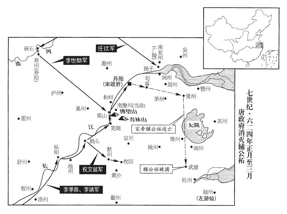 先是,輔公祏遣其將馮慧亮、陳當世將舟師三萬屯博望山‹安徽省当涂县西南›,天門山在宣州當塗縣西南三十里,又名蛾眉山,夾江對峙,東曰博望,西曰梁山。先,悉薦翻。將,即亮翻;下同。考異曰:舊趙郡王孝恭傳作「陳當時」。舊李靖傳云:「屯當塗。」今皆從高祖實錄。陳正通、徐紹宗將步騎三萬屯青林山‹当涂县东南›,水經註:湖水出廬江郡之東陵鄉,禹貢所謂「過九江至于東陵」者也。西南流,水積為湖,湖西有青林山。又今當塗縣東南有青山。仍於梁山連鐵鎖以斷江路,斷,丁管翻。築卻月城,延袤十餘里,袤,音茂。又結壘江‹长江›西‹安徽省和县以西›以拒官軍。孝恭與李靖帥舟師次舒州‹安徽省潜山县›,李世勣帥步卒一萬渡淮,拔壽陽‹安徽省寿县›,次硤石‹寿县北›。帥,讀曰率。慧亮等堅壁不戰,孝恭遣奇兵絕其糧道,慧亮等軍乏食,夜,遣兵薄孝恭營,孝恭堅臥不動。孝恭集諸將議軍事,皆曰:「慧亮等擁強兵,據水陸之險,攻之不可猝拔,不如直指丹楊,掩其巢穴,丹楊既潰,慧亮等自降矣!」降,戶江翻。孝恭將從其議,李靖曰:「公祏精兵雖在此水陸二軍,然所自將亦不為少,今博望諸柵尚不能拔,公祏保據石頭,豈易取哉!易,以豉翻。進攻丹楊,旬月不下,慧亮躡吾後,腹背受敵,此危道也。李靖此議與長孫無忌安市之議略同。然李靖決勝而太宗無功,及安市班師,靖咎其不能用道宗之策。此用兵之所以難也。慧亮、正通皆百戰餘賊,其心非不欲戰,正以公祏立計使之持重,欲以老我師耳。我今攻其城以挑之,挑,徒了翻。一舉可破也!」孝恭然之,使羸兵先攻賊營而勒精兵結陳以待之。羸,倫為翻。陳,讀曰陣。攻壘者不勝而走,賊出兵追之,行數里,遇大軍,與戰,大破之。此左傳楚五大夫破吳師以滅舒鳩之故智也。闞稜免冑謂賊眾曰:「汝曹不識我邪?邪,音耶。何敢來與我戰!」賊多稜故部曲,皆無鬬志,或有拜者,由是遂敗。孝恭、靖乘勝逐北,轉戰百餘里,博山、青林兩戍皆潰,慧亮、正通等遁歸,殺傷及溺死者萬餘人。溺,奴狄翻。李靖兵先至丹楊,公祏大懼,擁兵數萬,棄城東走,欲就左遊仙於會稽‹浙江省绍兴市›,李世勣追之。公祏至句容‹江苏省句容市›,句容縣,漢屬丹楊郡,時屬蔣州,在建康城東九十里。從兵能屬者纔五百人,從,才用翻。屬,之欲翻。夜,宿常州‹江苏省常州市›,其將吳騷等謀執之。公祏覺之,棄妻子,獨將腹心數十人,斬關走。至武康‹浙江省德清县西武康镇›,吳分烏程、餘杭立永安縣,晉改為永康,又改為武康,屬湖州,在州西南一百七里。為野人所攻,西門君儀戰死,執公祏,送丹楊梟首,梟,堅堯翻。分捕餘黨,悉誅之,江南皆平。