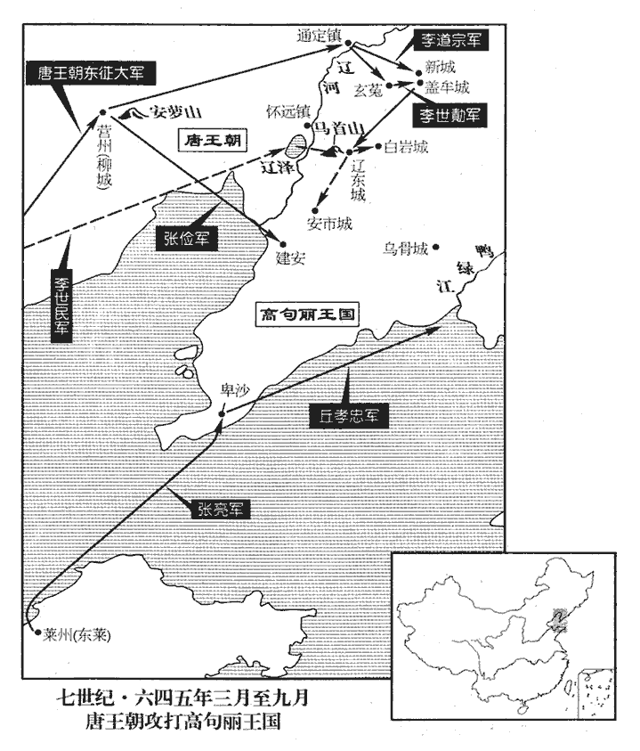 李世勣軍發柳城‹营州州政府所在县·辽宁省朝阳市›,柳城縣,營州治所。多張形勢,若出懷遠鎮‹辽宁省辽中县›者,營州有懷遠守捉城。而潛師北趣甬道‹隋军在辽河上搭浮桥,称”甬道”›,出高麗不意。夏,四月,戊戌朔‹一›,世勣自通定‹辽宁省新民市东›濟遼水,通定鎮在遼水西,隋大業八年伐遼所置。甬道,隋起浮橋渡遼水所築。趣,七喻翻。甬,余隴翻。至玄菟‹辽宁省沈阳市›。陳壽曰:漢武帝開玄菟郡,治沃沮,後為夷貊所侵,徙郡句驪縣。西北有遼山,遼水所出。高麗‹首都平壤朝鲜平壤市›大駭,城邑皆閉門自守。壬寅‹五›,遼東道副大總管江夏王道宗將兵數千至新城‹辽宁省抚顺市北›,夏,戶雅翻。將,即亮翻;下同。考異曰:唐曆:「張儉懼敵,不敢深入。江夏王道宗固請將百騎覘賊,帝許之。因問往返幾日,對曰:『往十日,周覽十日,返十日,總經一月,望謁陛下。』遂秣馬束兵,經歷險阻,直登遼東城南,觀其地形險易,安營置陳之所。及還,賊已引兵斷其歸路,道宗擊之盡殪,斬關而出,如期謁見。帝歎曰:『賁、育之勇,何以過此!』賜金五十斤,絹千匹。」今從實錄。折衝都尉曹三良引十餘騎直壓城門,城中驚擾,無敢出者。騎,奇寄翻。營州‹总部设辽宁省朝阳市›都督張儉將胡兵為前鋒,進渡遼水,趨建安城‹辽宁省盖州市›,自遼東城西行三百里至建安城,漢平郭縣地。趨,七喻翻。破高麗兵,斬首數千級。