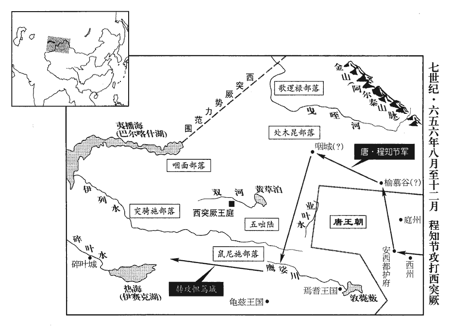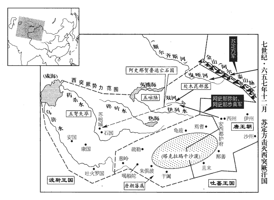 3庚戌‹二十一›,以左屯衛將軍蘇定方為伊麗道行軍總管,伊麗河,一名帝帝河。帥燕然都護‹都护府设内蒙古乌拉特中旗›渭南‹陕西省渭南市›任雅相、燕然都護府在黃河北,北至陰山七十里,至回紇界七百里,去京師二千七百里;龍朔三年改曰瀚海都督府,總章二年,改為安北大都護府。杜佑曰:後為中受降城,南去朔方千三百餘里。後魏於渭南置渭南郡,隋廢為縣,屬京兆。帥,讀曰率。燕,因肩翻。任,音壬。相,息亮翻。副都護蕭嗣業發回紇‹蒙古国北部›等兵,自北道討西突厥沙鉢羅可汗。嗣業,鉅之子也。蕭鉅見一百八十一卷隋煬帝大業六年。