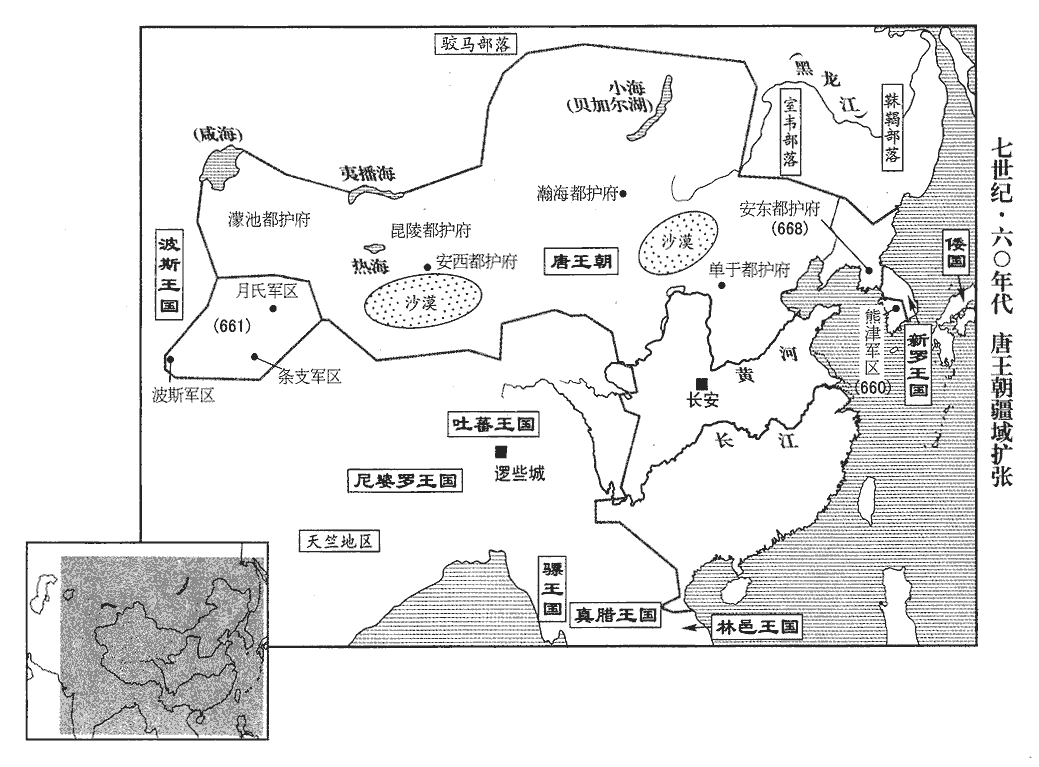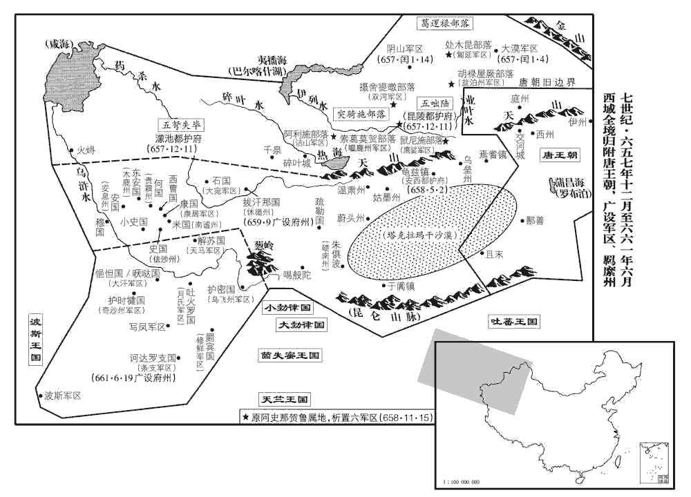7六月,癸未‹十九›,以吐火羅‹阿富汗北部汗阿巴德›、嚈噠‹阿富汗北部马扎里沙里夫城›、罽賓‹阿富汗喀布尔市›、波斯‹伊朗高原›等十六國罽賓,隋漕國也,居蔥嶺南,距長安萬二千里而贏。四國及訶達羅支國、解蘇國、骨咄施國、帆延國、石汗那國、護時犍國、怛沒國、烏拉喝國、多勒建國、俱蜜國、護蜜多國、久越得犍國,凡十六。嚈,益涉翻。噠,當割翻,又宅軋翻。罽,音計。置都督府八,州七十六,考異曰:唐曆云:「置州二十六」,今從統紀。今按新書地理志,時自于闐以西,波斯以東,凡十六國,各以其王都為都督府。吐火羅國都為月氏都督府,領州二十五。嚈噠國都為大汗都督府,領州十五。訶達羅支國都‹阿富汗加兹尼城›為條支都督府,領州九。解蘇國都‹塔吉克斯坦杜尚别市›為天馬都督府,領州二。骨咄施國都‹塔吉克斯坦杜尚别市南库尔干秋别城›為高附都督府,領州二。罽賓國都為脩鮮都督府,領州十。帆延國都‹阿富汗中部巴米安城›為寫鳳都督府,領州四。石汗那國都‹阿富汗东北部斯科萨城›為悅般州都督府,領州二。護時犍國都‹阿富汗西北部萨尔普勒城›為奇沙州都督府,領州二。怛沒國都‹中亚铁尔梅兹市›為姑墨州都督府,領州一。烏拉喝國都‹乌那曷国·阿富汗西北部安德胡伊城›為旅獒州都督府,多勒建國都‹阿富汗西北部迈马纳城›為崑墟州都督府,俱蜜國都‹塔吉克斯坦杜尚别市东北纳瓦巴德城›為至拔州都督府,護蜜多國都‹塔吉克斯坦喷赤河北岸伊什卡希姆城›為烏飛州都督府,領州一;久越得犍國都‹塔吉克斯坦沙尔图兹›為王庭州都督府,波斯國都為波斯都督府。通鑑言置都督府八者,蓋謂月氏、大汗、條支、天馬、高附、脩鮮、寫鳳、波斯八都督府,餘悅般等八州都督府不預也。新志所載領州七十二,其數亦與通鑑所引統紀不合。縣一百一十,軍府一百二十六,並隸安西都護府‹设新疆库车县›。