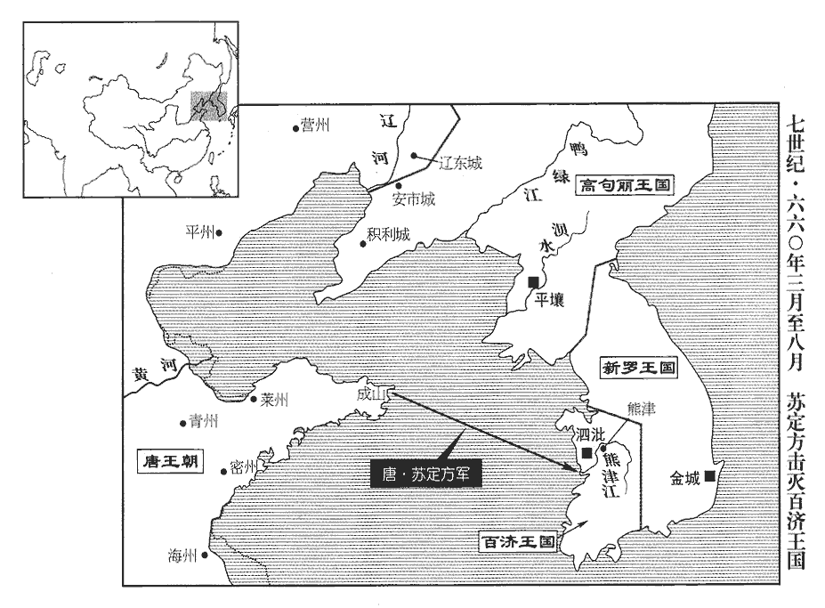 11蘇定方引兵自成山‹山东省荣成市东北成山角›濟海,百濟據熊津江‹锦江›口以拒之。定方進擊破之,百濟死者數千人,餘皆潰走。定方水陸齊進,直趣其都城‹泗沘韩国扶馀市›。北史:百濟都俱拔城,亦曰固麻城,其外更有五方,中方曰古沙城,東方曰得安城,南方曰久知下城,西方曰刀先城,北方曰熊津城。趣,七喻翻。未至二十餘里,百濟傾國來戰,大破之,殺萬餘人,追奔,入其郭。百濟王義慈及太子隆逃于北境,定方進圍其城;義慈次子泰自立為王,帥眾固守。隆子文思曰:「王與太子皆在,而叔遽擁兵自王,帥,讀曰率;下同。王,于況翻。借使能卻唐兵,我父子必不全矣。」遂帥左右踰城來降,百姓皆從之,泰不能止。定方命軍士登城立幟,泰窘迫,開門請命。於是義慈、隆及諸城主皆降。降,戶江翻。幟,昌志翻。百濟故有五部,分統三十七郡、二百城、七十六萬戶,詔以其地置熊津‹总部设熊津城韩国公州市›等五都督府,熊津、馬韓、東明、金連、德安五都督府。以其酋長為都督、刺史。酋,慈由翻。長,知兩翻。