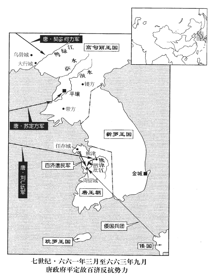 4初,蘇定方既平百濟‹首都泗沘韩国扶馀市›,留郎將劉仁願鎮守百濟府城,又以左衛中郎將王文度為熊津都督‹总部设韩国公州市›,撫其餘眾。文度濟海而卒,卒,子恤翻。百濟僧道琛、故將福信聚眾據周留城‹朝鲜半岛韩山城›,將,即亮翻。迎故王子豐於倭國‹日本›而立之,倭,烏禾翻。引兵圍仁願於府城。詔起劉仁軌檢校帶方州‹朝鲜沙里院城›刺史,帶方州置於百濟界,因古地名以名州。考異曰:僉載云:「劉仁願以仁軌檢校帶方州刺史。」今從本傳。將王文度之眾,便道發新羅‹首都金城韩国庆州市›兵以救仁願。將,即亮翻。仁軌喜曰:「天將富貴此翁矣!」於州司請唐曆及廟諱以行,按劉仁軌自青州刺史白衣從軍,此蓋於青州州司請之也。曰:「吾欲掃平東夷,頒大唐正朔於海表!」仁軌御軍嚴整,轉鬬而前,所向皆下。百濟立兩柵於熊津江口‹锦江口›,仁軌與新羅兵合擊,破之,殺溺死者萬餘人。溺,奴狄翻。道琛乃釋府城之圍,退保任存城‹朝鲜半岛大兴城›;任存城在百濟西部任存山。考異曰:實錄或作「任孝城」,未知孰是。今從其多者。新羅糧盡,引還。道琛自稱領軍將軍,福信自稱霜岑將軍,招集徒眾,其勢益張。張:知亮翻。仁軌眾少,與仁願合軍,休息士卒。少,詩沼翻。上詔新羅出兵,新羅王春秋奉詔,遣其將金欽將兵救仁軌等,至古泗‹朝鲜半岛古埠县›,福信邀擊,敗之。將,即亮翻。敗,補邁翻。欽自葛嶺道遁還新羅,不敢復出。復,扶又翻。福信尋殺道琛,專總國兵。