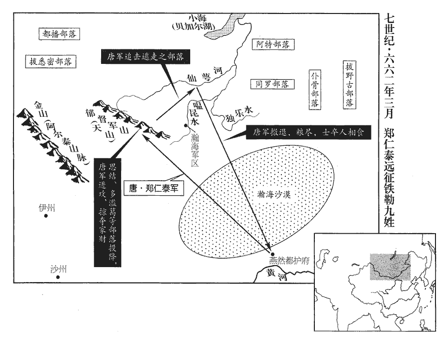 12壬午‹十四›,左武衛大將軍鄭仁泰將兵討思結‹蒙古国巴彦洪戈尔市›、拔也固‹即拔野古部落·内蒙古呼伦湖西›、僕骨‹即仆固部落·蒙古国东部›、同羅‹蒙古国乌兰巴托市北›四部,拔也固即拔野古。僕骨即僕固。將,即亮翻。三戰皆捷,追奔百餘里,斬其酋長而還。