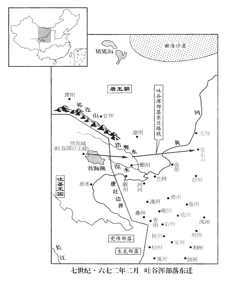 3二月,庚午‹八›,徙吐谷渾於鄯州‹青海省乐都县›浩亹水‹大通河›南。漢書地理志:浩亹水東至允吾入湟。允吾,唐為鄯州龍支縣。水經註:浩亹河出允吾西北塞外,東逕浩亹縣故城南,又東流注于湟水,俗呼為閤門河。吐,從暾入聲。谷,音浴。鄯,時戰翻。浩,音誥。亹,音門。吐谷渾畏吐蕃‹首都逻些城西藏拉萨市›之強,不安其居,又鄯州地狹,尋徙靈州‹宁夏灵武市›,以其部落置安樂州‹宁夏中宁县›,時以靈州鳴沙縣地置安樂州。樂,音洛。以可汗諾曷鉢為刺史。可,從刊入聲。汗,音寒。吐谷渾故地皆入於吐蕃。