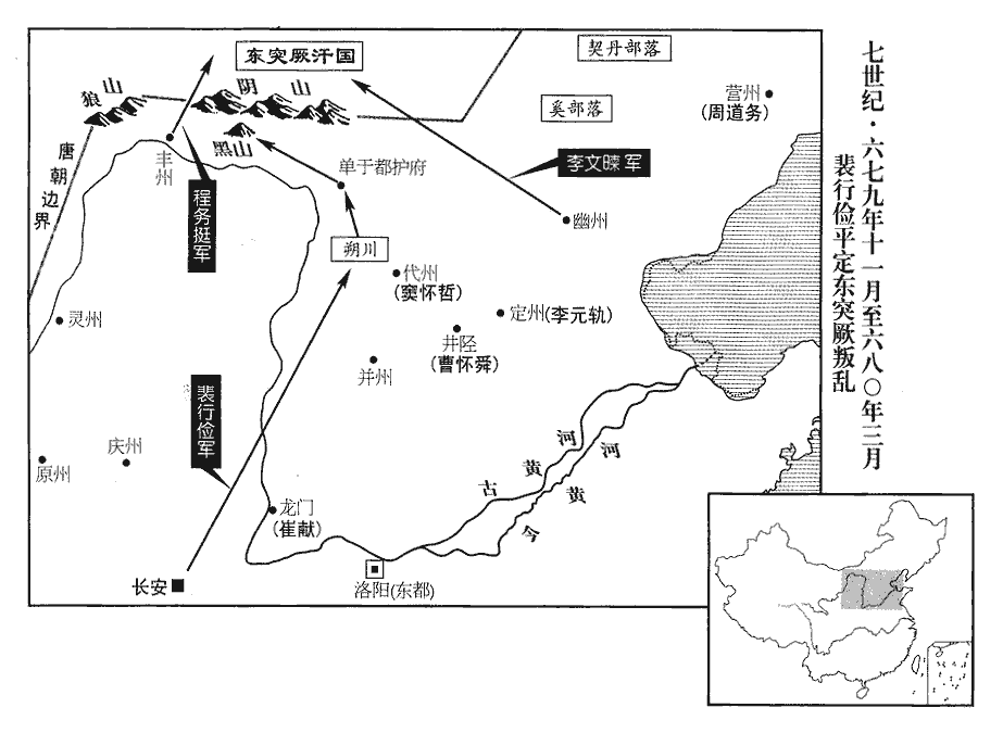3裴行儉軍既還,突厥阿史那伏念復自立為可汗,復,扶又翻。杜佑曰:伏念,頡利從兄之子。與阿史德溫傅連兵為寇。癸巳‹二十三›,以行儉為定襄道大總管,以右武衛將軍曹懷舜、幽州‹总部设北京市›都督李文暕為副,將兵討之。暕,古限翻。將,即亮翻。