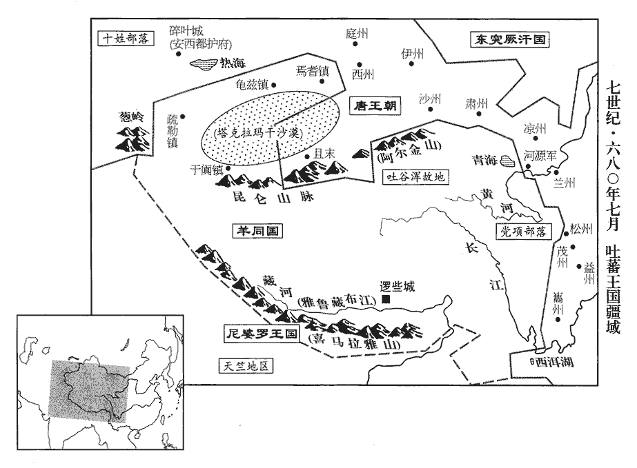 先是,劍南‹四川省中南部及云南省›募兵於茂州‹四川省茂县›,西南築安戎城‹四川省理县西›,以斷吐蕃通蠻之路。宋白曰:茂州本冉駹máng之國,漢開為汶山郡。華陽國志云:宣帝地節三年,武都白馬羌反,使駱武平定之。汶山吏民詣武自訟,一歲再度更賦至重,邊人貧苦,無以供給,求省郡,遂省汶山郡,復置都尉。今州即漢蜀郡汶江縣,梁普通三年,置繩州,取桃關之路以繩作橋以名州。後周為汶州,置汶山縣。唐改茂州,取界內茂滋山而名。吐蕃以生羌為鄉導,先,悉薦翻。斷,丁管翻。鄉,讀曰嚮。攻陷其城,以兵據之,由是西洱‹云南省大理市东洱海›諸蠻皆降於吐蕃。洱,而志翻。降,戶江翻。吐蕃盡據羊同‹西藏西北部›、党項‹四川省西北部›及諸羌之地,東接涼‹甘肃省武成市›、松‹四川省松潘县›、茂‹四川省茂县›、巂‹四川省西昌市›等州,南鄰天竺‹印度›,西陷龜茲‹新疆库车县›、疏勒‹新疆喀什市›等四鎮,党,底朗翻。巂,音髓。龜茲,音丘慈。北抵突厥‹西突厥与吐蕃以天山山脉西段为界›,地方萬餘里,諸胡之盛,莫與為比。