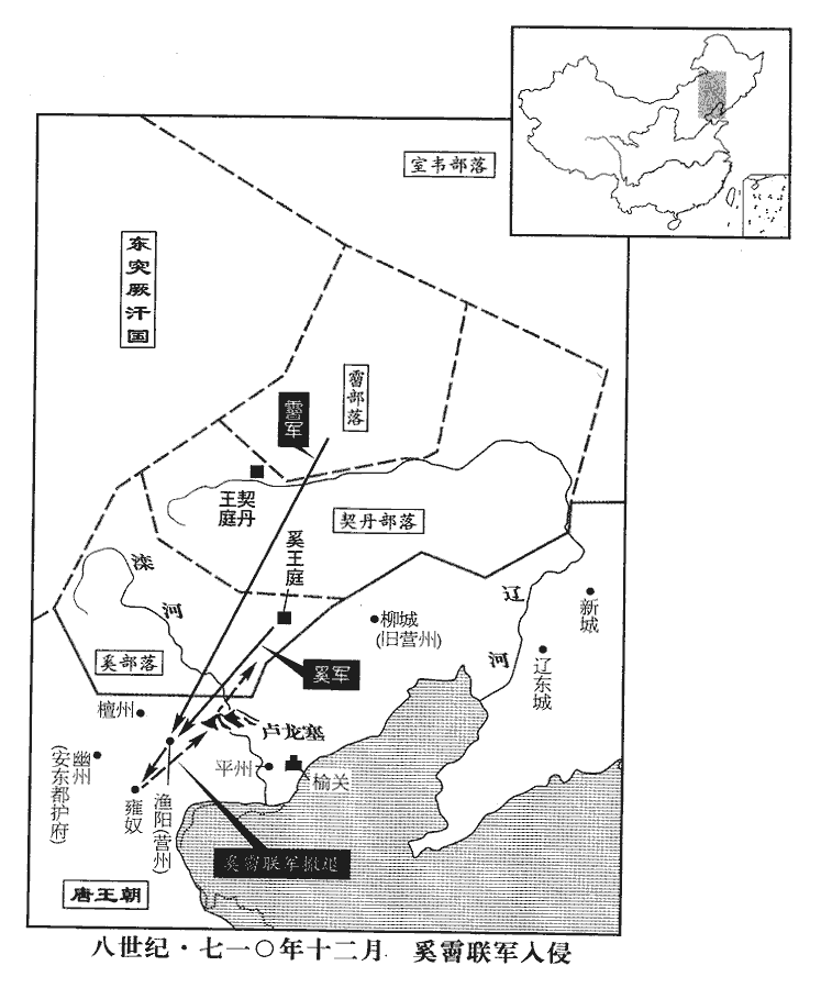 20壬辰‹十六›,奚‹滦河上游›、霫‹辽河以北›犯塞,掠漁陽‹天津市蓟县›、雍奴‹天津市武清县›,出盧龍塞‹河北省迁安县西北›而去。漁陽縣本屬幽州,中宗神龍元年分屬營州。雍奴縣,漢以來屬漁陽郡,隋屬涿郡,唐屬幽州。盧龍,漢肥如縣也,屬遼西郡,隋開皇十八年,更名盧龍,屬北平郡,唐帶平州。霫,而立翻。幽州都督‹总部设北京市›薛訥追擊之,弗克。