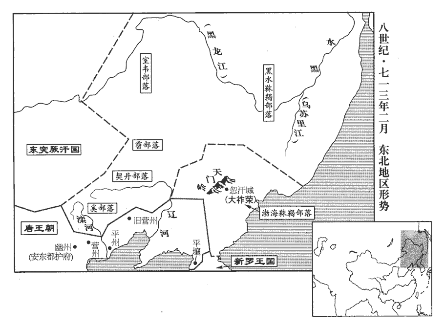 5初,高麗既亡,高麗亡見二百一卷高宗總章元年。其別種大祚榮徙居營州‹辽宁省朝阳市›。及李盡忠反,李盡忠反見二百五卷武后萬歲通天元年。風俗通:大姓,大庭氏之後;大款為顓zhuān帝師。按禮記曰:大連善居喪,東夷之子也。蓋東夷之有大姓尚矣。種,章勇翻。祚榮與靺鞨‹黑龙江下游›乞四北羽聚眾東走,阻險自固,靺鞨,音末曷。盡忠死,武后使將軍李楷固討其餘黨。楷固擊乞四北羽,斬之,引兵踰天門嶺‹吉林省敦化市西北威虎岭›,逼祚榮。新書:天門嶺在土護真河北三百里。祚榮逆戰,楷固大敗,僅以身免。祚榮遂帥其眾東據東牟山‹敦化市北›,築城居之。東牟山在挹婁國界,地直營州東二千里,南北(與?)新羅以泥河為境,東窮海,西契丹。帥,讀曰率。祚榮驍勇善戰,驍,堅堯翻;下同。高麗、靺鞨之人稍稍歸之,地方二千里,戶十餘萬,勝兵數萬人,勝,音升。自稱振國王,附于突厥‹瀚海沙漠群›。時奚‹滦河上游›、契丹‹辽河上游›皆叛,道路阻絕,武后不能討。中宗即位,遣侍御史張行岌招慰之,岌jí,魚及翻。祚榮遣子入侍。至是,以祚榮為左驍衛大將軍、勃海郡王;以其所部為忽汗州‹吉林省敦化市›,令祚榮兼都督。靺鞨自此盛矣;始去靺鞨,專號勃海。