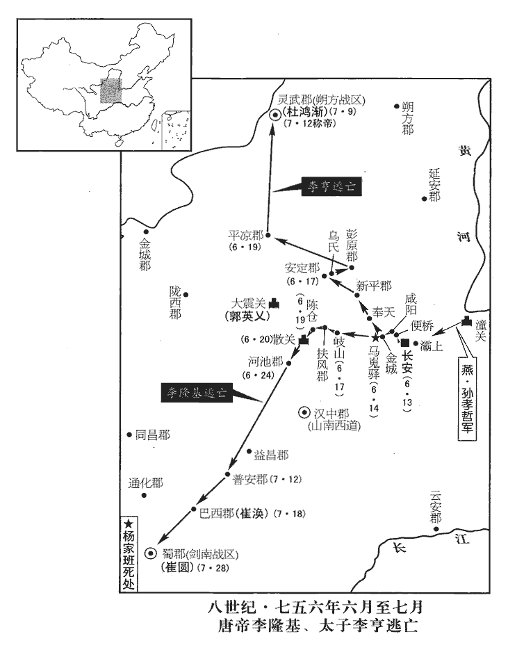 5太子既留,莫知所適。廣平王俶chù曰:「日漸晏,此不可駐,眾欲何之?」皆莫對。建寧王倓tán曰:「殿下昔嘗為朔方節度大使,事見二百十三卷開元十五年。將吏歲時致啟,倓略識其姓名。今河西、隴右之眾皆敗降賊,將,即亮翻。降,戶江翻。父兄子弟多在賊中,或生異圖。朔方道近,士馬全盛,裴冕衣冠名族,必無貳心。時裴冕為河西行軍司馬。賊入長安方虜掠,未暇徇地,乘此速往就之,徐圖大舉,此上策也。」眾皆曰:「善!」至渭濱,遇潼關敗卒,誤與之戰,死傷甚眾。已,乃收餘卒,擇渭水淺處,乘馬涉渡;無馬者涕泣而返。太子自奉天‹陕西省乾县›北上,文明元年,分京兆之醴泉、始平、好畤、武功,豳州之永壽縣,置奉天縣,以奉乾陵,在長安西北一百五十里。上,時掌翻。比至新平‹陕西省彬县›,比,必寐翻,及也。通夜馳三百里,士卒、器械失亡過半,所存之眾不過數百。新平太守薛羽棄郡走,太子斬之。是日,至安定‹甘肃省泾川县›,太守徐瑴jué亦走,又斬之。新平郡,豳州。安定郡,涇州。守,手又翻;下同。瑴,訖岳翻。