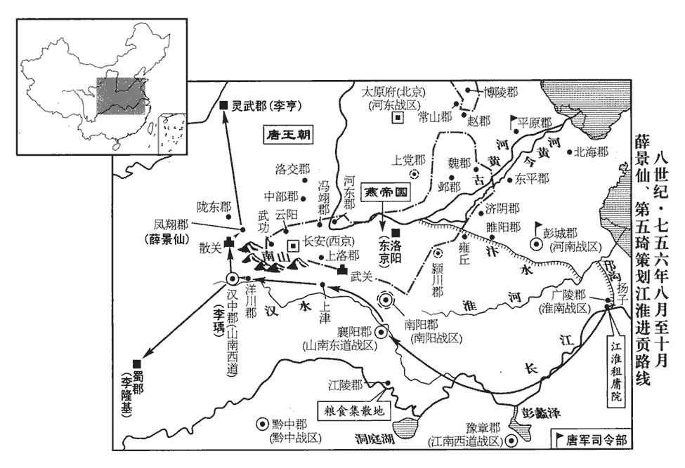 16丁卯‹十五›,上皇制:「以太子亨充天下兵馬元帥,領朔方、河東、河北、平盧節度都使,南取長安、洛陽。甲子,太子即位於靈武,丁卯,上皇下此制,蓋道里相去遼遠,蜀中未之知也。帥,所類翻。使,疏吏翻。以御史中丞裴冕兼左庶子,隴西郡‹甘肃省陇西县›司馬劉秩試守右庶子;隴西郡,渭州。劉秩必房琯所薦。永王璘‹李隆基的儿子›充山南東道、嶺南•黔中•江南西道‹总部设豫章江西省南昌市›節度都使,以少府監竇紹為之傅,璘,離珍翻。黔,音琴。少,始照翻。長沙‹湖南省长沙市›太守李峴為都副大使;節度都副大使也。盛王琦充廣陵‹总部设江苏省扬州市›大都督,領江南東路‹总部设吴郡江苏省苏州市›及淮南‹总部跟广陵军区同设广陵江苏省扬州市›、河南等路節度都使,以前江陵‹总部设湖北省江陵县›都督府長史劉彙為之傅,廣陵郡‹江苏省扬州市›長史李成式為都副大使;廣陵郡,揚州。豐王珙gǒng充武威都督,仍領河西、隴右、安西‹总部设龟兹新疆库车县›、北庭‹总部设北庭府新疆吉木萨尔县›等路節度都使,以隴西‹甘肃省陇西县›太守濟陰鄧景山為之傅,充都副大使。諸道各有節度使,以諸王為都使以統之;其不赴鎮者,都副大使攝統。濟,子禮翻。應須士馬、甲仗、糧賜等,並於當路自供。其諸路本節度使虢王巨等並依前充使。依前為節度使也。其署置官屬及本路郡縣官,並任自簡擇,署訖聞奏。」時琦、珙皆不出閤,惟璘赴鎮。為璘舉兵作亂張本。置山南東道節度使,領襄陽等九郡。領襄州襄陽郡、鄧州南陽郡、隨州漢東郡、唐州淮安郡、均州武當郡、房州房陵郡、(安州安陸郡、)金州安康郡、商州上洛郡。升五府經略使為嶺南‹总部设南海广东省广州市›節度,領南海‹广州市›等二十二郡。升五溪經略使為黔中節度,領黔中等諸郡。註見上年。黔,音琴。分江南為東、西二道,東道領餘杭‹浙江省杭州市›,西道領豫章‹江西省南昌市›等諸郡。餘杭郡,杭州。豫章郡,洪州。先是,四方聞潼關失守,莫知上所之,及是制下,始知乘輿所在。先,悉薦翻。守,式又翻。乘,繩證翻。彙,秩之弟也。
