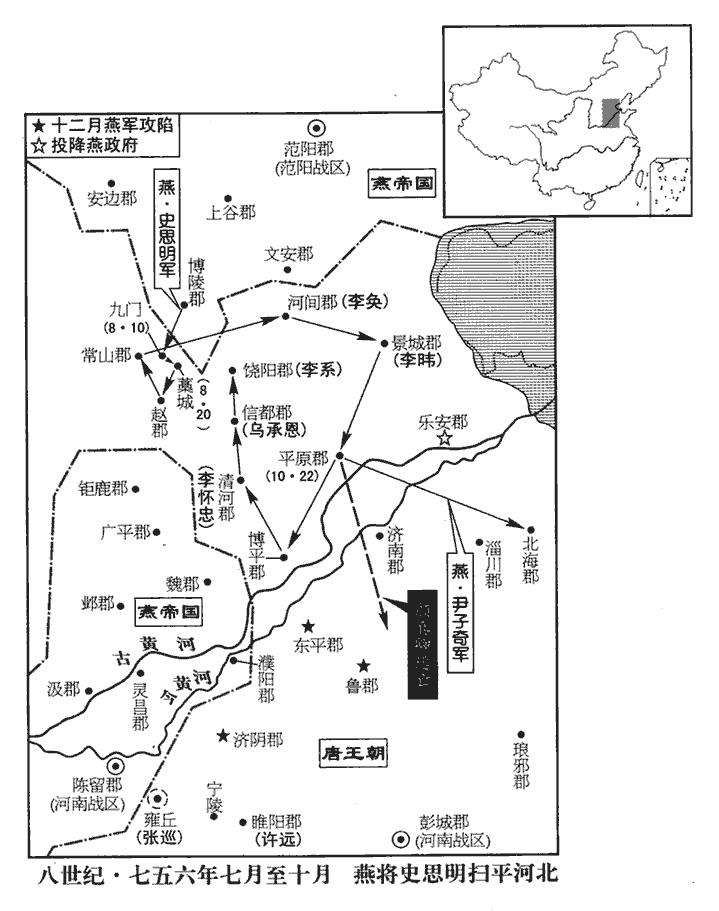 10尹子奇圍河間,四十餘日不下,史思明引兵會之。顏真卿遣其將和琳將萬二千人救河間,思明逆擊,擒之,遂陷河間;執李奐送洛陽,殺之。又陷景城‹河北省沧州市东南›,太守李暐赴湛水死。新書作赴河死。思明使兩騎齎尺書以招樂安‹山东省惠民县›,樂安即時舉郡降。樂安郡,棣州。景城既陷,樂安孤絕,即時降賊。蓋人心危懼,城主不能守也。又使其將康沒野波將先鋒攻平原,兵未至,顏真卿知力不敵,壬寅‹二十二›,棄郡渡河南走。思明即以平原兵攻清河、博平,皆陷之。清河郡,貝州。博平郡,博州。考異曰:河洛春秋云:「蔡希德引兵攻貝州,貝州陷。攻博州,五日,城陷。」今從肅宗實錄。思明引兵圍烏承恩於信都,承恩【章:十二行本「恩」下有「以城」二字;乙十一行本同;孔本同;退齋校同。】降,親導思明入城,交兵馬、倉庫,馬三千匹、兵萬人。信都郡,冀州。降,戶江翻。史言烏承恩兵力足以拒守。思明送承恩詣洛陽,祿山復其官爵。