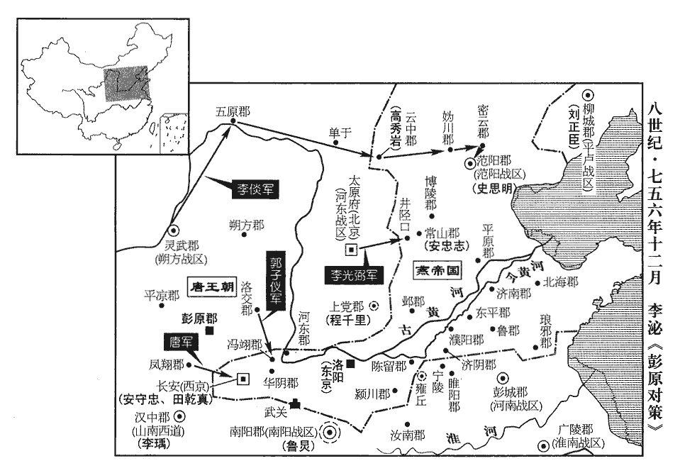 16上問李泌曰:「今敵強如此,何時可定?」對曰:「臣觀賊所獲子女金帛,皆輸之范陽‹北京市›,輸,舂遇翻。此豈有雄據四海之志邪!邪,音耶。今獨虜將或為之用,中國之人惟高尚等數人,自餘皆脅從耳。以臣料之,不過二年,天下無寇矣。」上曰:「何故?」對曰:「賊之驍將,不過史思明、安守忠、田乾真、張忠志、阿史那承慶等數人而已。將,即亮翻。驍,堅堯翻。過,古禾翻,又古臥翻。張忠志,即安忠志,此時已復舊養父之姓。今若令李光弼自太原出井陘,郭子儀自馮翊‹陕西省大荔县›入河東,則思明、忠志不敢離范陽、常山,守忠、乾真不敢離長安,令,力丁翻。陘,音刑。離,力智翻。是以兩軍縶其四將也,從祿山者,獨承慶耳。願敕子儀勿取華陰,華,戶化翻。使兩京之道常通,陛下以所徵之兵軍於扶風,與子儀、光弼互出擊之,彼救首則擊其尾,救尾則擊其首,使賊往來數千里,疲於奔命,我常以逸待勞,賊至則避其鋒,去則乘其弊,不攻城,不遏路。來春復命建寧為范陽節度大使,並塞北出,復,扶又翻,又音如字。使,疏吏翻。並,步浪翻。與光弼南北掎角以取范陽,泌欲使建寧自靈、夏並豐、勝、雲、朔之塞,直擣媯、檀,攻范陽之北;光弼自太原取恆、定,以攻范陽之南。覆其巢穴。賊退則無所歸,留則不獲安,然後大軍四合而攻之,必成擒矣。」使肅宗用泌策,史思明豈能再為關、洛之患乎!上悅。