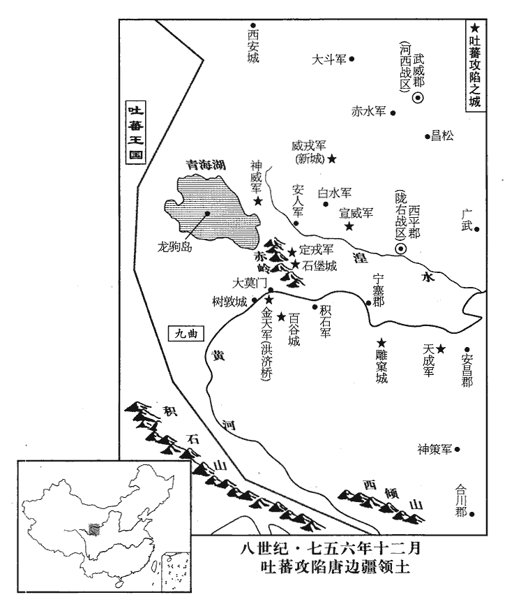 21吐蕃陷威戎‹青海省门源县›、神威‹青海省海晏县›、定戎‹青海省湟源县西南›、宣威‹青海省大通县东南›、制勝、金天‹青海省共和县西南›、天成‹甘肃省积石山县›等軍,石堡城‹青海省湟源县西南›、百谷城‹青海省共和县东南›、雕窠城‹青海省同仁县›。定戎軍在石堡城北,隔澗七里。廓州西南百四十里有洪濟橋、金天軍,其東南八十里有百谷城。河州西八十里索恭川有天成軍,西百餘里有雕窠城。皆天寶十三載置。