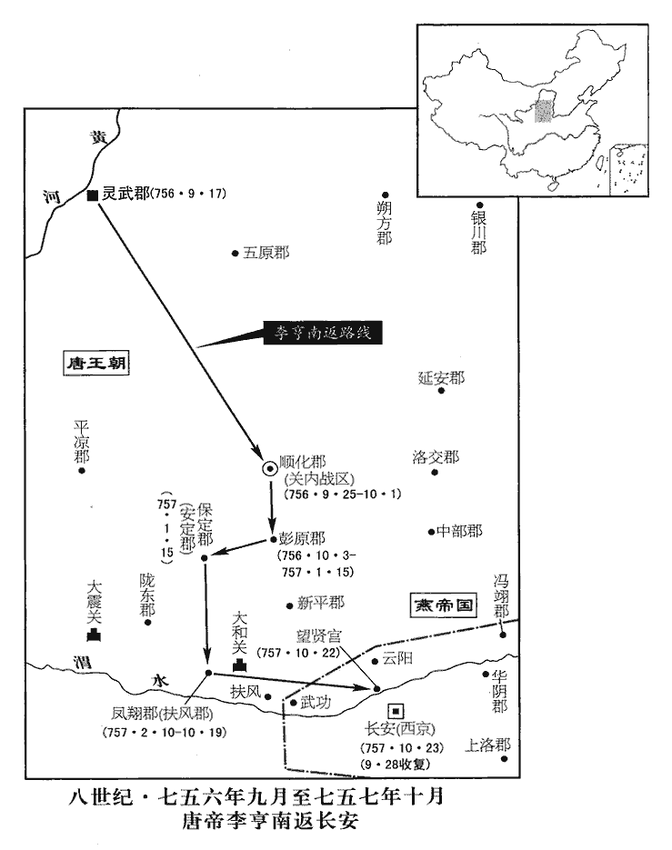 2上發順化‹甘肃省庆阳县›,宋白曰:慶州,貞觀以來為弘化郡,天寶後為安化郡,至德為順化郡。癸未‹三›,至彭原‹甘肃省宁县›。