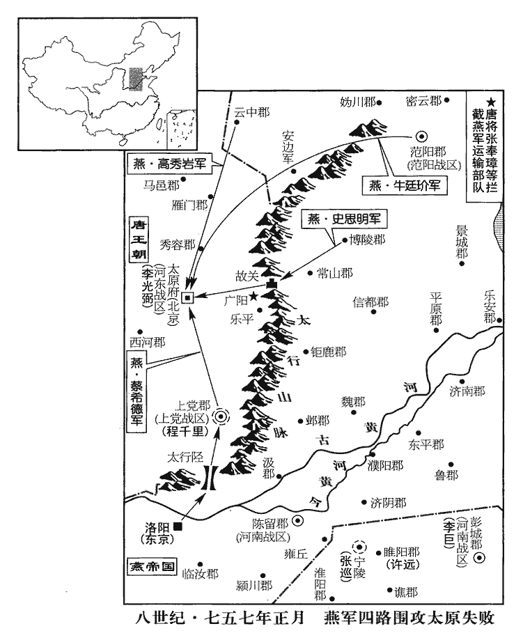 8史思明自博陵‹河北省定州市›,蔡希德自太行‹河南省博爱县北›,高秀巖自大同‹云中郡·山西省大同市›,牛廷介自范陽‹北京市›,引兵共十萬,寇太原‹山西省太原市›。行,戶剛翻。博陵郡,定州。蔡希德自上黨下太行道也。高秀巖為賊守大同,自此趨太原。牛廷介自幽州,與史思明等合。李光弼麾下精兵皆赴朔方‹总部设灵武宁夏灵武市›,餘團練烏合之眾不滿萬人。思明以為太原指掌可取,既得之,當遂長驅取朔方、河、隴。‹甘肃省及青海省东部›太原諸將皆懼,議脩城以待之,光弼曰:「太原城周四十里,太原都城,左汾右晉,潛丘在中,長四千三百二十一步,廣二千一百二十二步,周萬五千一百五十三步。宮城在都城西北,周二千五百二十步。汾東曰東城,貞觀十一年長史李勣所築。兩城之間曰中城,武后築。以合東城。周四十里者,止言都城耳。賊垂至而興役,是未見敵先自困也。」乃帥士卒及民於城外鑿壕以自固。作墼jī數十萬,帥,讀曰率。墼,古歷翻,範土為之。眾莫知所用;及賊攻城於外,光弼用之增壘於內,壞輒補之。思明使人取攻具於山東‹太行山以东›,以胡兵三千衛送之,至廣陽‹山西省平定县›,廣陽,漢上艾縣,後漢改石艾縣,天寶元年更名,屬太原府。井陘關在其東,葦澤關在其東北,皆通山東之道。別將慕容溢、張奉璋邀擊,盡殺之。