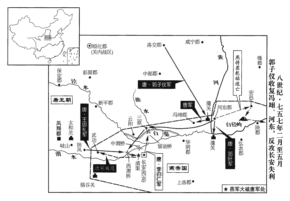子儀與王思禮軍合於西渭橋‹便桥·陕西省咸阳市西南›,進屯潏yù‹渭水支流,流经长安城西南›西。唐都長安,跨渭為三橋:東曰東渭橋,中曰中渭橋,西曰西渭橋。程大昌曰:秦、漢、唐架渭者凡三橋:在咸陽西十里名便橋,漢武帝造;在咸陽東南二十二里者名中渭橋,秦始皇造;在萬年縣東南四十里者為東渭橋,不知始於何世。水經註:潏水出杜陵之樊川,過漢長安城西,而北注于渭。潏,音決。安守忠、李歸仁軍於京城西清渠。程大昌雍錄有漢、唐要地參出圖:唐京城西有漕渠,南出豐水,逕延平、金光二門,至京城西北角,屈而東流,逕漢故長安城,南至芳林園西,又屈而北流,入渭。清渠在漕渠之東,直秦之故杜南城稍東,即香積寺北。相守七日,官軍不進。五月,癸丑‹六›,守忠偽退,子儀悉師逐之。賊以驍騎九千為長蛇陳,陳,讀曰陣。官軍擊之,首尾為兩翼,夾擊官軍,官軍大潰。判官韓液、監軍孫知古皆為賊所擒,軍資器械盡棄之。子儀退保武功,監,古銜翻。考異曰:汾陽家傳曰:「賊帥安守忠、李歸仁領八萬兵,屯於昆明池西,五月三日,陳於清渠之側。公大破之,追奔十餘里,斬首二萬級。六日,救兵至,又陣于清渠,我師敗績。以冒暑毒,師人多病,遂收兵赴鳳翔。」今從舊傳。中外戒嚴。