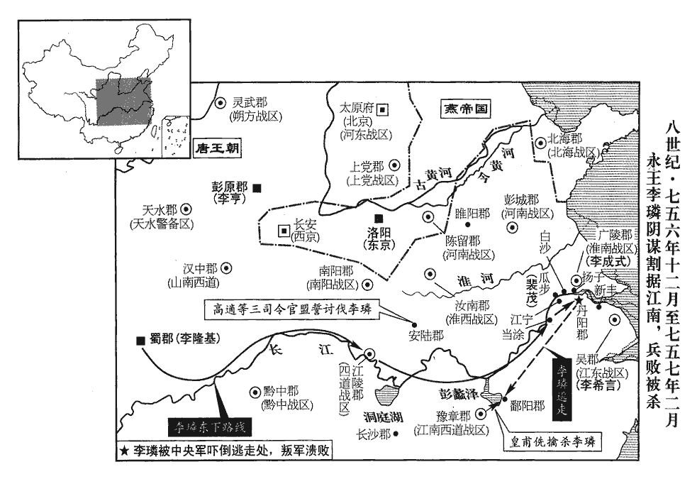 14永王璘,幼失母,璘,郭順儀之子也,順儀早死。為上所鞠養,常抱之以眠;從上皇入蜀。上皇命諸子分總天下節制,事見上卷七月。諫議大夫高適諫,以為不可;上皇不聽。璘領四道節度都使‹四道:山南东道湖北省›、岭南道广东、广西、海南及越南北部、黔中道贵州省、江南西道江西省及湖南省,鎮江陵。時江、淮租賦山積於江陵,璘召募勇士數萬人,日費巨萬。璘生長深宮,不更人事,子襄城王瑒chàng,有勇力,好兵,有薛鏐liú等為之謀主,長,知兩翻。更,工衡翻。瑒,徒杏翻,又音暢。好,呼到翻。鏐,力求翻。以為今天下大亂,惟南方完富,璘握四道兵,封疆數千里,宜據金陵‹江苏省南京市›,康曰:楚威王埋金以鎮王氣,故曰金陵。保有江表‹江东·江苏省南部太湖流域›,如東晉故事。上聞之,敕璘歸覲于蜀;璘不從。江陵長史李峴辭疾赴行在,璘將稱兵,峴不欲預其禍也。上召高適與之謀。適陳江東利害,且言璘必敗之狀。十二月,置淮南節度使,領廣陵等十二郡,以適為之;置淮南西道節度使,領汝南‹河南省汝南县›等五郡,以來瑱tiàn為之;淮南節度使,領揚州廣陵郡、楚州山陽郡、滁州全椒郡、和州歷陽郡、壽州淮南郡、廬州合肥郡、舒州同安郡、光州弋陽郡、蘄州蘄春郡、安州安陸郡、黃州齊安郡、申州義陽郡、沔州漢陽郡,凡十三。淮南西道節度使,領蔡州汝南郡、鄭州滎陽郡、許州潁川郡、光州弋陽郡、申州義陽郡。已上皆據新書方鎮表。但義陽、弋陽已屬淮南節度,當考。使與江東節度使韋陟共圖璘。方鎮表:至德二載,置江東防禦使,治杭州。蓋謂浙江之東也。韋陟所節度者,蓋江南東道也。其巡屬兼有浙東、西及昇、宣、歙諸州。
