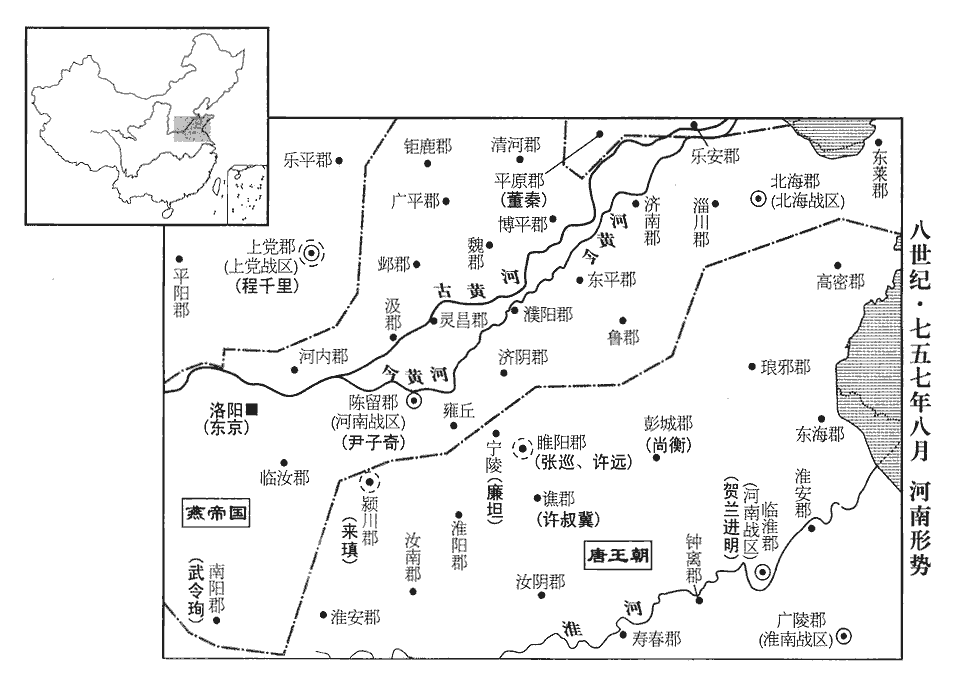 19令狐潮、李庭望攻雍丘,數月不下,乃置杞州,築城於雍丘之北令,力丁翻。雍丘,唐初置杞州,貞觀元年廢。賊復置之,築城以逼雍丘。以絕其糧援。賊常數萬人,而張巡眾纔千餘,每戰輒克。河南節度使虢王巨屯彭城‹江苏省徐州市›,假巡先鋒使。是月,魯‹山东省兖州市›、東平、濟陰陷于賊。彭城郡,徐州。魯郡,兗州。東平郡,鄆州。濟,子禮翻。賊將楊朝宗帥馬步二萬,將襲寧陵‹河南省杞县东五十五千米›,斷巡後。斷,丁管翻。巡遂拔雍丘,東守寧陵以待之,帥,讀曰率。范成大北使錄:雍丘,百二十里至寧陵。始與睢陽太守許遠相見。是日,楊朝宗至寧陵城西北,巡、遠與戰,晝夜數十合,大破之,斬首萬餘級,流尸塞汴而下,睢,音雖。守,式又翻。塞,悉則翻。賊收兵夜遁。敕以巡為河南節度副使。巡以將士有功,遣使詣虢王巨請空名告身及賜物,巨唯與折衝、果毅告身三十通,不與賜物。巡移書責巨,巨竟不應。使,疏吏翻。將,即亮翻。折,之舌翻。
