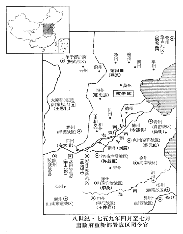 12甲辰‹八›,置陳、鄭、亳節度使‹总部设陈州河南省淮阳县›,以鄧州刺史魯炅為之;以徐州‹江苏省徐州市›刺史尚衡為青、密七州節度使‹总部设青州山东省青州市›;七州,青、密、登、萊、淄、沂、海。炅,古迥翻。以興平軍‹总部设商州陕西省商州市›節度使李奐兼豫、許、汝三州節度使‹总部设豫州河南省汝南县›;仍各於境上守捉防禦。陳、鄭、亳前此未嘗置節鎮,魯炅自南陽為之。青、密等七州,尚衡自彭城升統之。興平軍本置於雍州始平縣,李奐時在行營,使統豫、許、汝三州。此皆臨時分鎮,非有一定規模也。