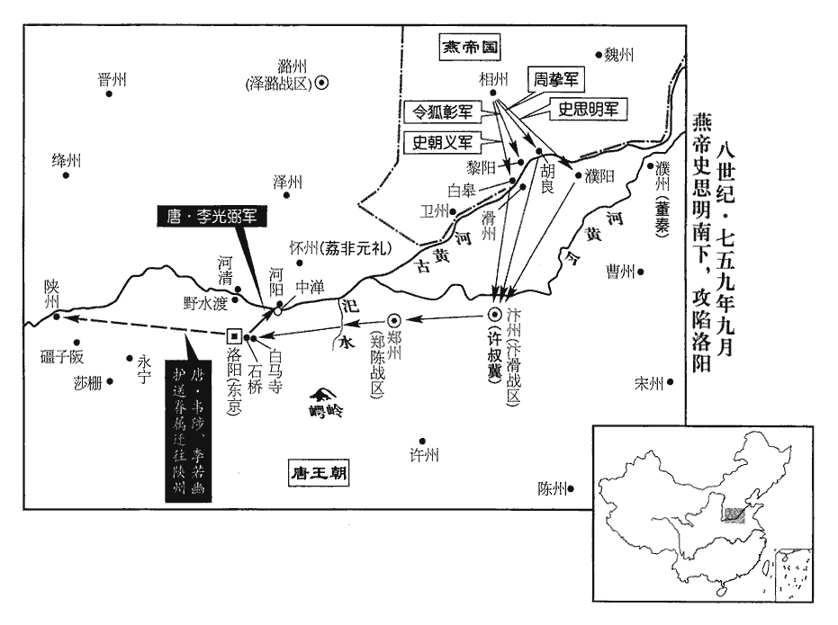 〖译文〗 [30]史思明让他的儿子史朝清守卫范阳,然后命令各郡太守各率兵三千跟随自己南下进攻河南地区,把军队分为四路:命部将令狐彰率兵五千从黎阳渡河进攻滑州,史思明自己率兵从濮阳渡黄河,史朝义率兵从白皋渡黄河,周挚率兵从胡良渡过黄河,约好在汴州会合。