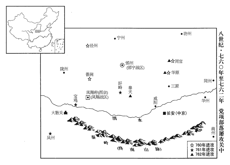 3党項等羌‹四川省西北部›吞噬邊鄙,將逼京畿,乃分邠、寧等州‹总部设邠州陕西省彬县›節度為鄜坊、丹延‹总部设鄜州陕西省富县›節度,亦謂之渭北節度。邠寧節度領州九,分四州為渭北節度。鄜,音膚。以邠州刺史桑如珪領邠寧,鄜州刺史杜冕領鄜坊節度副使,分道招討。戊子‹二十六›,以郭子儀領兩道節度使,兩道,邠寧、鄜坊也。留京師,假其威名以鎮之。