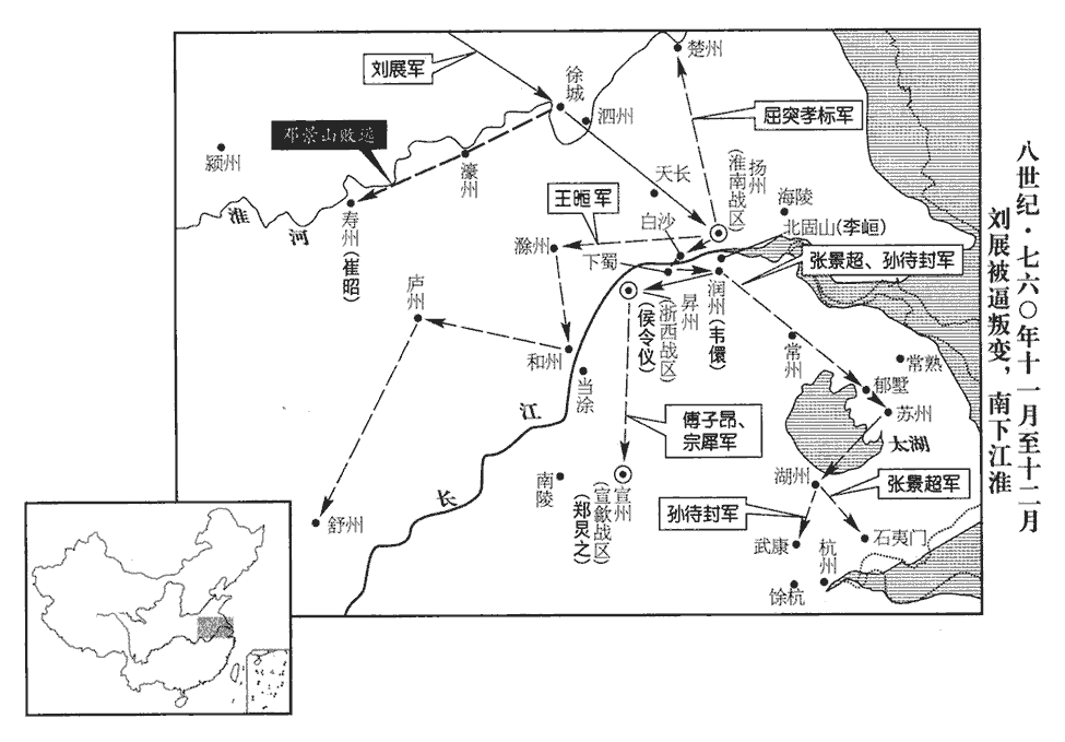 延恩因說上曰:「展與李銑一體之人,今銑誅,展不自安,苟不去之,恐其為亂。然展方握強兵,宜以計去之。說,式芮翻。去,羌呂翻。請除展江淮都統,代李峘huán,峘,戶登翻。俟其釋兵赴鎮,中道執之,此一夫力耳。」上從之,以展為都統淮南東‹总部设扬州江苏省扬州市›、江南西‹总部设洪州江西省南昌市›、浙西‹总部设昇州江苏省南京市›三道節度使;考異曰:沈既濟劉展亂紀云:「淮南東道、浙江西道凡二十三州,置都統節度。」下云:「以展為都統江南、淮南節度使。」下又云:「三道皆發吏申圖籍。」按舊李峘傳:「峘都統淮南、江南、江西節度。」展既代峘,其所統亦三道耳。淮南者,東道楊、楚、滁、和、舒、廬、濠、壽八州也。江南者,浙西昇、潤、常、蘇、湖、杭、睦七州也。江西者,洪、虔、江、吉、袁、信、撫七州也。凡二十二州。亂紀誤以「二」為「三」,又脫「江南西道」字耳。密敕舊都統李峘及淮南東道節度使鄧景山圖之。李峘為浙東節度兼淮南,見上卷元年。按唐會要:乾元元年十二月,李峘除都統淮南、江東、江西節度、宣慰、觀察、處置等使。都統之名起於此。通鑑但書以浙東兼淮東,與會要少異。
