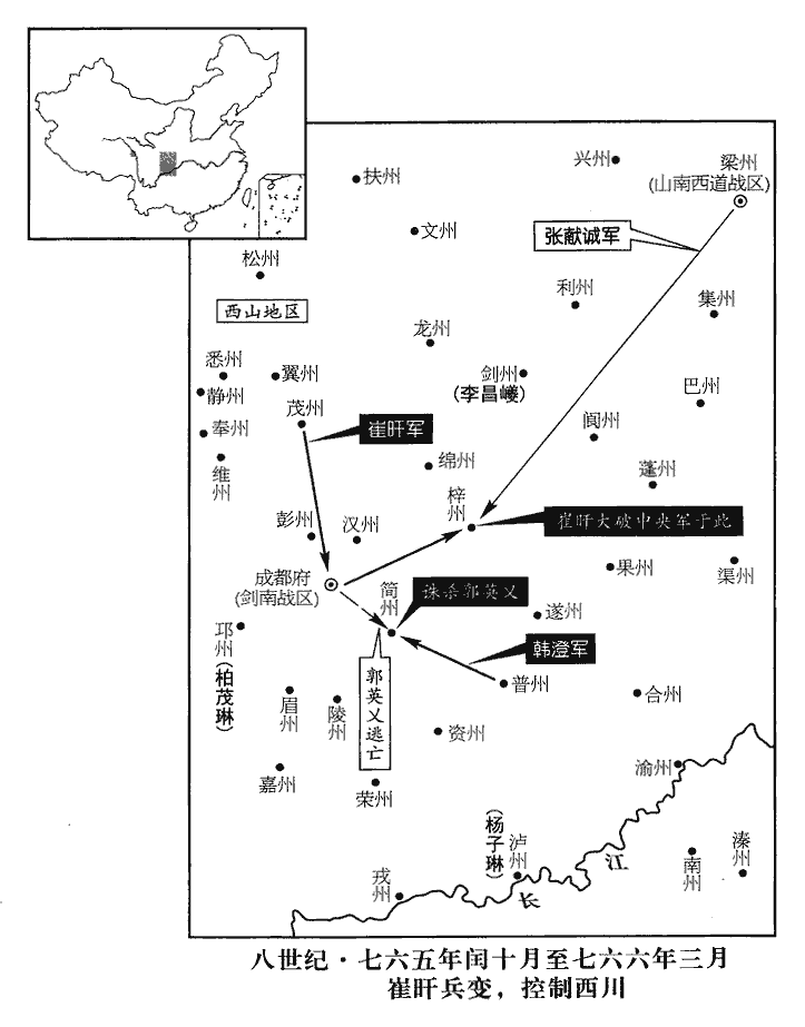 5初,劍南節度使嚴武奏將軍崔旰為利州‹四川省广元市›刺史;時蜀中‹四川省›新亂,山賊塞路,塞,昔則翻。旰討平之。及武再鎮劍南,賂山南西道‹总部设梁州陕西省汉中市›節度使張獻誠以求旰,利州,古苴侯邑,秦、漢為葭萌之地。蜀漢為漢壽縣,晉為晉壽,梁為黎州,尋又改利州;天寶為益昌郡,乾元復為利州,山南西道巡屬也。旰,古旦翻。獻誠使旰移疾自解,詣武。武以為漢州‹四川省广汉市›刺史,使將兵擊吐蕃於西山‹成都市以西山区›,連拔其數城,攘地數百里;漢州,漢雒縣、什方、綿竹地,唐垂拱立漢州,天寶為德陽郡,乾元復為州。武作七寶轝yú迎旰入成都以寵之。