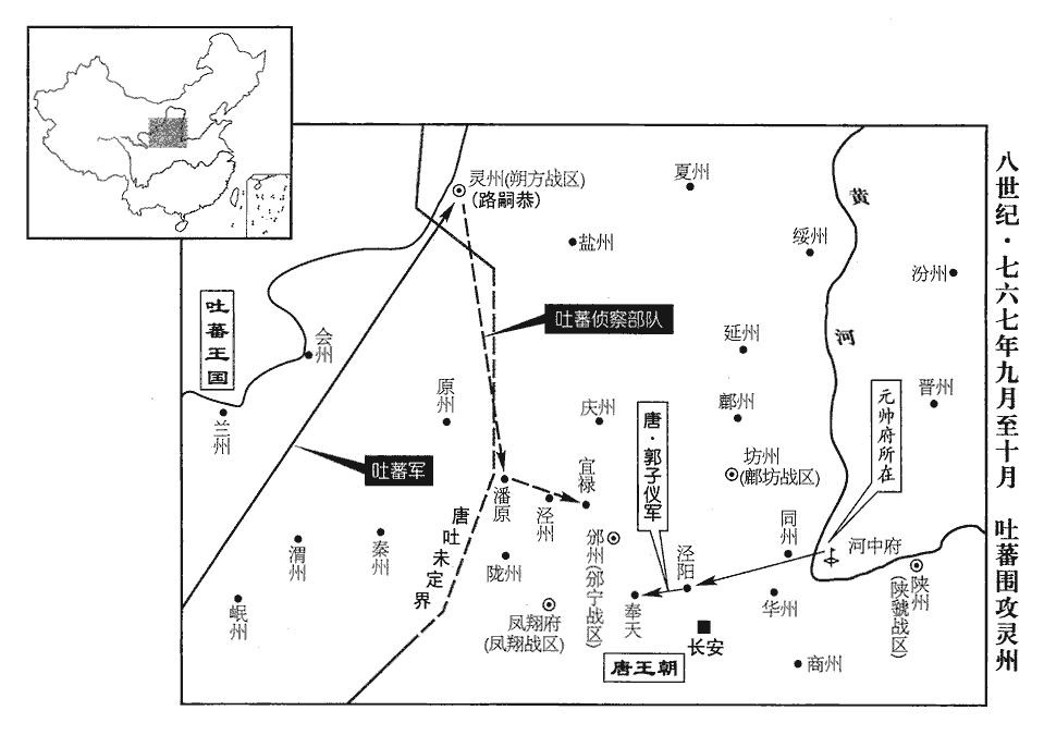 9九月,吐蕃眾數萬圍靈州,遊騎至潘原‹甘肃省平凉市东›、宜祿‹陕西省长武县›;潘原,本古陰盤縣,天寶元年,更名潘原,屬涇州。詔郭子儀自河中帥甲士三萬鎮涇陽‹陕西省泾阳县›,京師戒嚴。甲子‹十七›,子儀移鎮奉天‹陕西省乾县›。考異曰:汾陽家傳:「八月十七日,吐蕃至涇西。二十七日,詔統精卒一萬與馬璘合攻之。」今從實錄。實錄:「甲寅,寇靈州。乙卯,寇宜祿。」蓋據奏到日。今從唐曆。