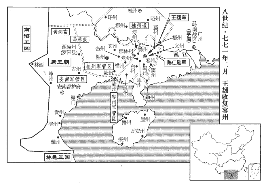 3嶺南蠻酋梁崇牽自稱平南十道大都統,據容州‹广西北流市›,酋,慈由翻。統,他綜翻,俗音從上聲。容州治普寧縣,漢合浦縣地,今州西有容山而名。與西原‹广西靖西县境›蠻張侯、夏永等連兵攻陷城邑,前容管經略使‹首府设容州›元結等皆寄治蒼梧‹梧州州政府所在县·广西梧州市›。容管領辯‹广东省化州市›、白‹广西博白县›、牢‹广西玉林市›、欽、禺‹广西陆川县东北›、湯‹越南谅山市东南›、瀼、巖、古等州,在桂管西南。武德四年,分靜州之蒼梧、豪靜置梧州。酋,慈由翻。經略使王翃至藤州‹广西藤县›,翃hóng,戶宏翻。以私財募兵,不數月,斬賊帥歐陽珪,馳詣廣州‹广东省广州市›,見節度使李勉,請兵以復容州;嶺南節度使治廣州,兼統五管,故詣之請兵。帥,所類翻。勉以為難,翃曰:「大夫如未暇出兵,但乞移牒諸州,揚言出千兵為援,冀藉聲勢,亦可成功。」勉從之。翃乃與義州刺史陳仁璀、宋白曰:義州,即漢蒼梧郡猛陵縣地,隋為永熙郡永業縣。唐武德四年,於此置南義州,天寶改為連城郡,乾元後為義州。璀,七罪翻。藤州刺史李曉庭等結盟討賊。藤州,治鐔xín津縣,漢之猛陵縣也。翃募得三千餘人,破賊數萬眾;攻容州,拔之,擒梁崇牽,前後大小百餘戰,盡復容州故地。分命諸將襲西原蠻,新書:西原蠻,居廣、容之南,邕、桂之西,北接道州、武岡,依阻峒穴,綿地數千里。將,即亮翻。復鬱林等諸州。