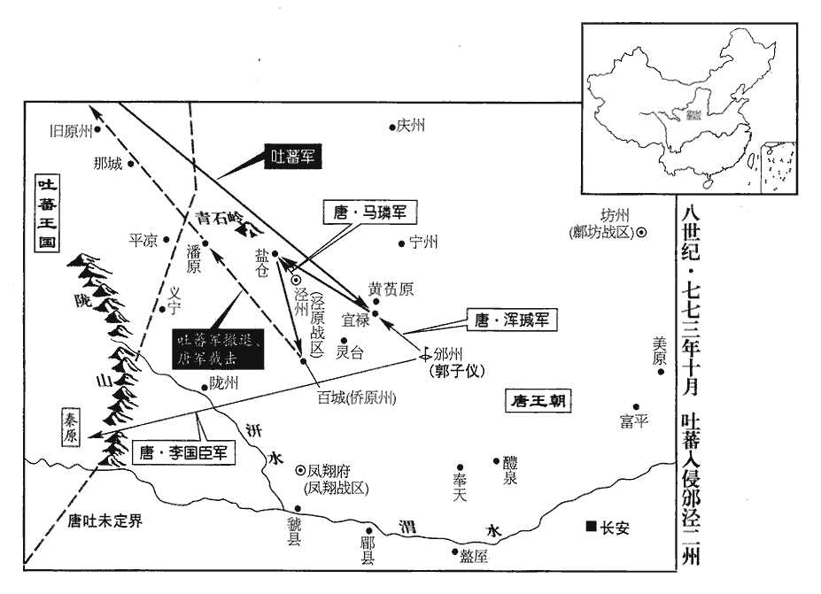 12九月,吐蕃下青石嶺‹甘肃省镇原县西南›,軍于那城‹宁夏彭阳县西古城乡›;青石嶺,在原州西。那城,即漢朝那,故城在原州花石川。吐,從暾入聲。郭子儀使人諭之,明日,引退。