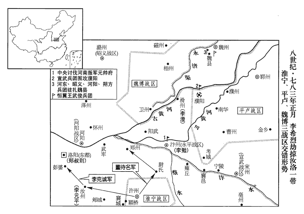 5丙寅‹十九›,以河陽三城‹河南省孟州市›、懷‹河南省沁阳市›、衛州‹河南省卫辉市›為河陽軍。‹总部河阳城。此时卫州仍为田悦占据›