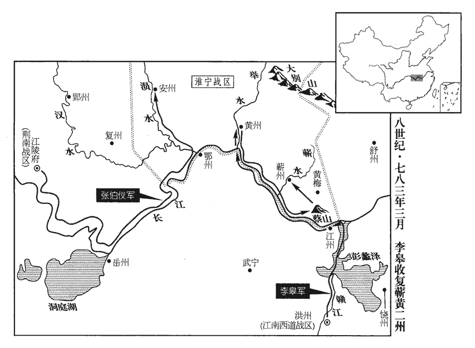 7三月,戊寅‹一›,江西‹总部设洪州江西省南昌市›節度使曹王皋敗李希烈將韓霜露於黃梅‹湖北省黄梅县›,斬之;辛卯‹十四›,拔黃州‹湖北省新洲县›。時希烈兵柵蔡山‹湖北省黄梅县西南蔡山镇›,敗,補邁翻。九域志:黃梅縣,屬蘄州,距州一百二十里。蔡山,在黃梅界,即江左新蔡郡治所,魯悉達保聚之地。宋白曰:宋分江夏郡置南新蔡郡;隋開皇十八年,改為黃梅縣,以界內黃梅山名之。祝穆曰:蔡山出大龜,春秋左氏傳所謂大蔡,蓋以山得名也。險不可攻。皋聲言西取蘄州‹湖北省蕲春县›,蘄qí,音祈。蘄州,後漢為蘄春侯國,吳置蘄春郡,北齊置齊昌郡及羅州,後周改蘄州。州北有蘄水,南入于江。地名解云:蘄春,以水隈wēi多蘄菜,因名。引舟師泝江而上,希烈之將引兵循江隨戰。去蔡山三百餘里,皋乃復放舟順流而下,上,時掌翻。復,扶又翻。下,遐嫁翻。急攻蔡山,拔之。希烈兵還救之,不及而敗。皋遂進拔蘄州,表伊慎為蘄州刺史,王鍔為江州‹江西省九江市›刺史。