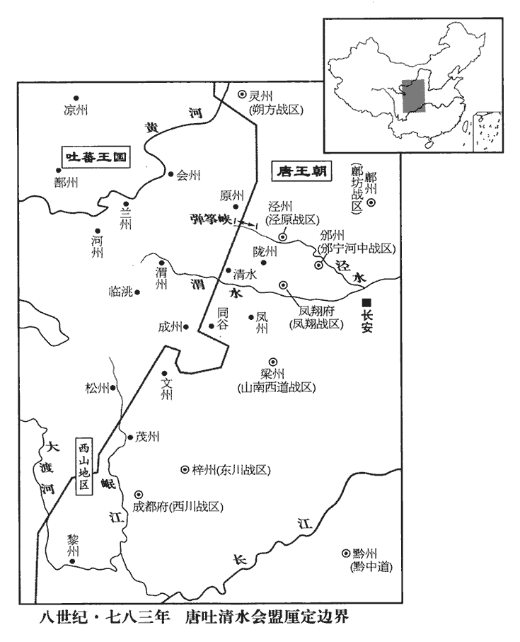 10上命宰相、尚書與吐蕃區頰贊盟於豐邑里,區頰贊以清水之盟,疆埸未定,不果盟。是年春,張鎰與吐蕃盟於清水。宋白曰:張鎰與吐蕃盟文曰:「今國家所守界,涇州,西至彈箏峽‹甘肃省平凉市西北›西口;隴州‹陕西省陇县›,西至清水縣;鳳州‹陕西省凤县›,西至同谷縣‹甘肃省成县›;暨劍南‹总部成都府›西山大渡河東,為漢界。蕃國,守備在蘭‹甘肃省兰州市›、渭‹甘肃省陇西县›、原‹宁夏固原县›、會‹甘肃省靖远县›,西至臨洮‹甘肃省岷县›,又東至成州‹甘肃省礼县南龙山镇›,抵劍南西界磨些諸蠻、大渡水西南,為蕃界。」相,息亮翻。尚,辰羊翻。吐,從暾入聲。埸,音亦。己未‹十三›,命崔漢衡入吐蕃,決於贊普。是年二月,命崔漢衡送區頰贊,蓋欲與之盟而遣之,久而盟未定。又命漢衡入吐蕃,決於贊普。此時中國疲於兵,彼固有以窺唐矣,盟無益也。